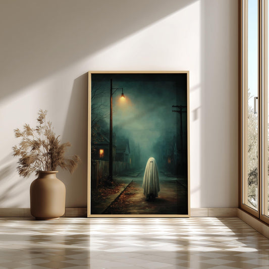 Ghost Suburban Poster – Porchlight Apparition Surreal Night Scene Wall Art