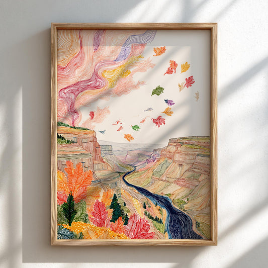Crimson Depths – Pastel Canyon Landscape Art Print & Whimsical Nature Wall Decor