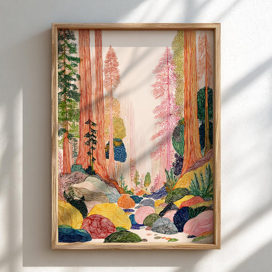Pastel Pine Forest Print – Serene Creek Landscape Wall Art