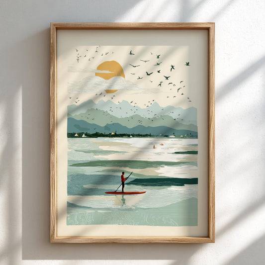 SUP on Serene Waters – Pastel Paddleboarding Art Print & Serene Nature Wall Decor
