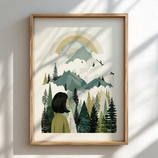 Misty Summit Whisper Poster – Pastel Forest View Wall Art