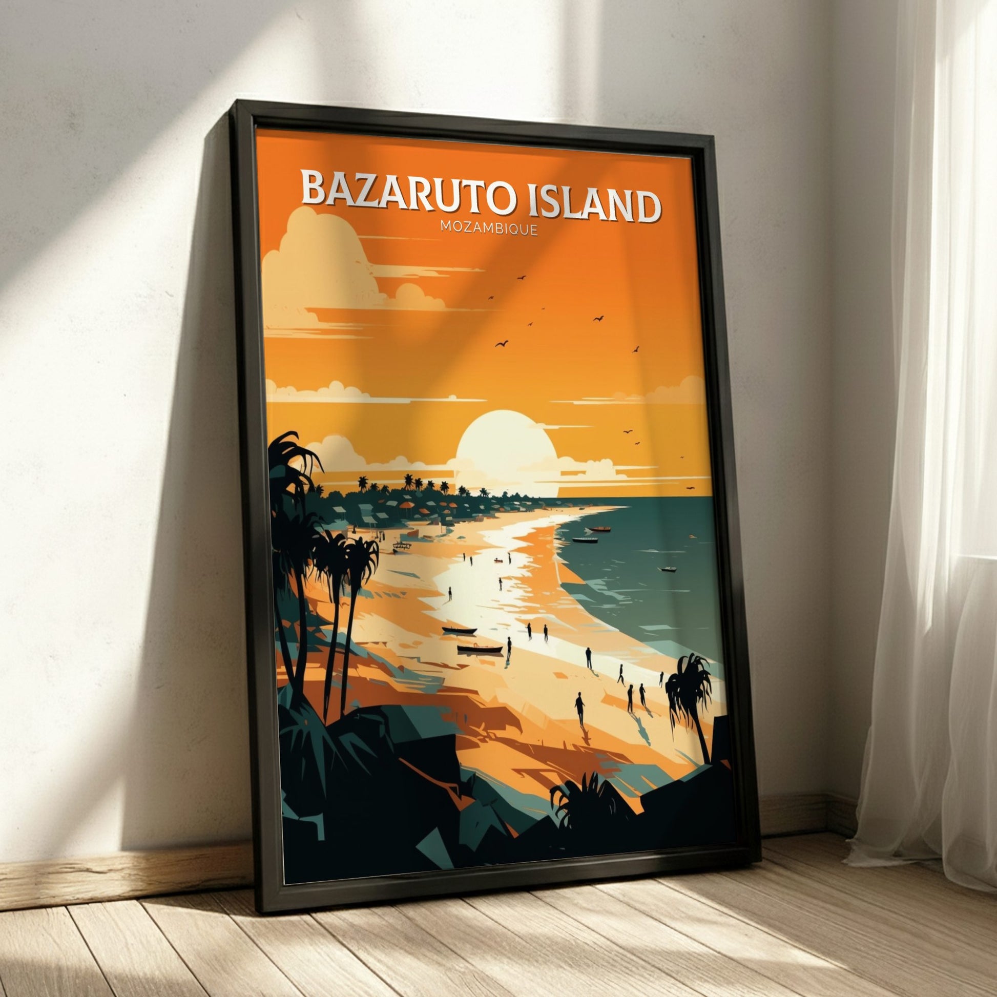 Unser Bazaruto-Reiseposter im Retro-Stil aus Mosambik entführt Sie mit seinem lebendigen Design in die unberührte Schönheit der mosambikanischen Insel Bazaruto. Es ist perfekt für Reisebegeisterte und Kunstliebhaber und fängt das türkisfarbene Wasser, den weißen Sand und die Korallenriffe der Insel in detailreichen Darstellungen ein. Ob Sie die Küste bereits bereist haben oder von diesem Paradies träumen – dieses Bazaruto-Retro-Poster ist eine atemberaubende Bereicherung für Ihre Einrichtung.