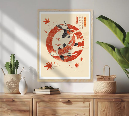 Affiche de poissons koï japonais - Art de style gravure sur bois