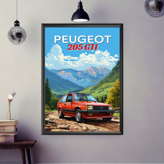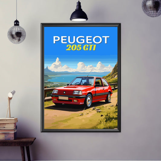 Affiche Peugeot 205 GTI des années 1980 – Décoration murale vintage française à hayon