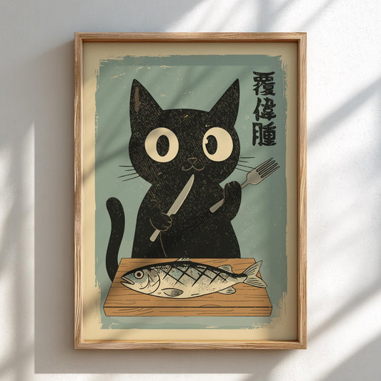 Impression d'art « Chat noir mangeant du poisson » – Décoration murale de style estampe japonaise pour les amoureux des chats