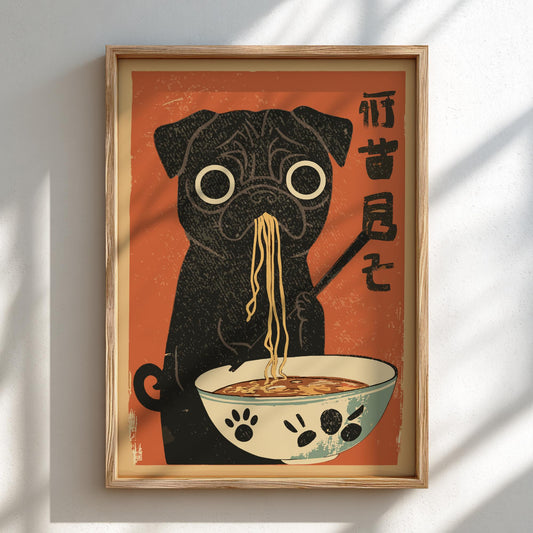 Ramen carlin noir affamé – Impression d'art culinaire japonais et décoration murale fantaisiste