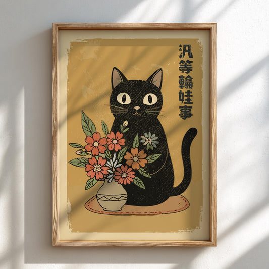Impression d'art Chat noir – Style japonais floral sur bois pour une décoration d'intérieur zen et cottagecore
