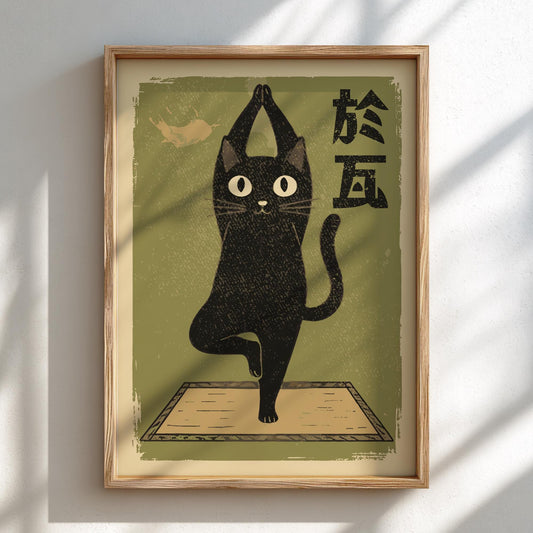 Impression de posture de yoga de l'arbre à chat – Art de fitness et zen de style estampe japonaise