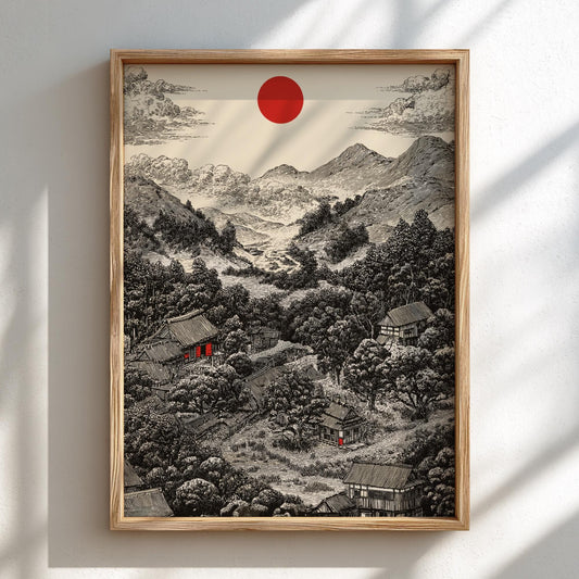 Impression d'art à l'encre japonaise – Paysage de village de montagne au soleil rouge pour une décoration zen