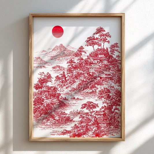 Impression d'art japonaise monochrome – Paysage de village de montagne lavé à l'encre rouge pour décoration zen