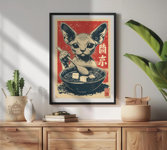 Affiche vintage représentant un chat mangeant des nouilles ramen – Décoration murale humoristique Sphynx