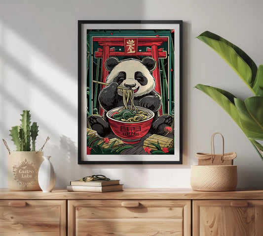 Affiche vintage représentant un panda mangeant des nouilles ramen – Imprimé panda d'inspiration japonaise