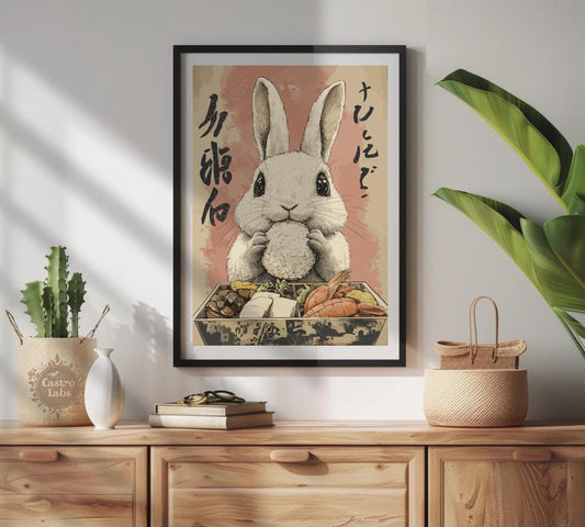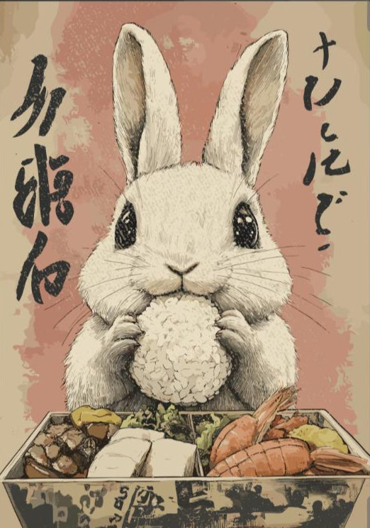 Affiche vintage représentant un lapin mangeant une boîte à bento – Art japonais amusant
