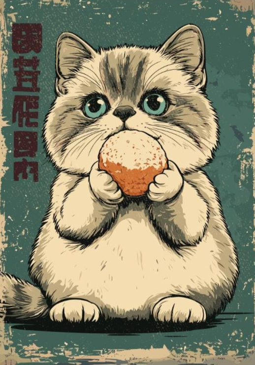 Affiche vintage de chat mangeant du mochi - Décoration murale amusante avec un chat Ragdoll