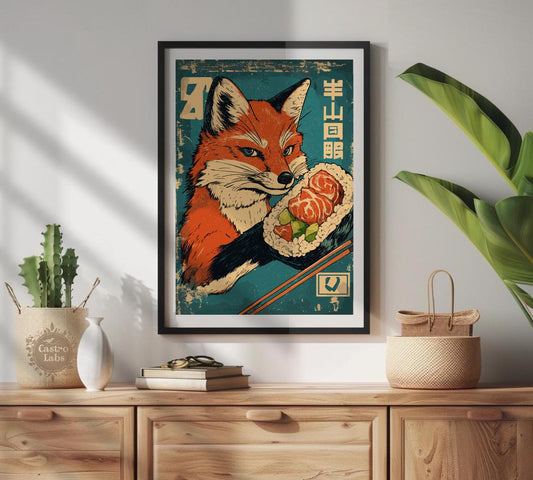 Affiche vintage de renard roux mangeant des sushis - Impression de renard roux d'inspiration japonaise