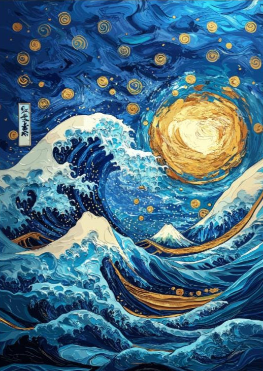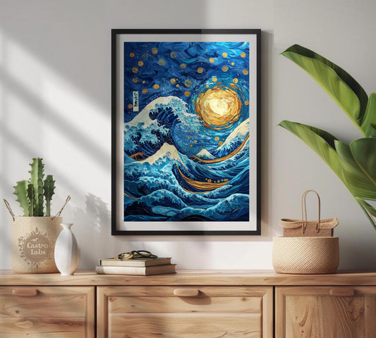 Impression d'art « La Grande Vague rencontre la Nuit étoilée » – Art mural fusion Hokusai et Van Gogh