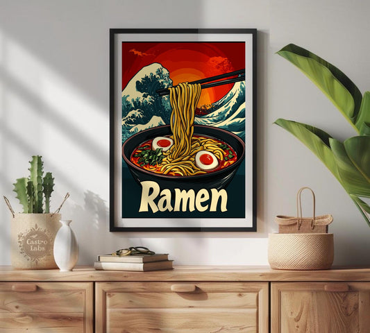 Affiche « Bol de ramen avec la Grande Vague » – Décoration de cuisine inspirée d'Hokusai