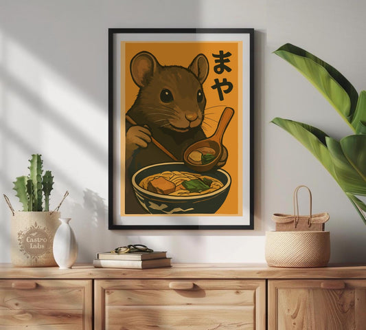 Affiche de souris mangeant des ramen – Impression de nourriture japonaise kawaii