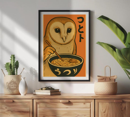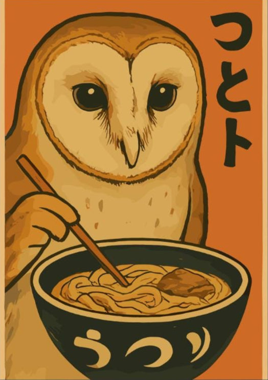 Affiche Hibou mangeant des ramen – Décoration murale hibou fantaisiste
