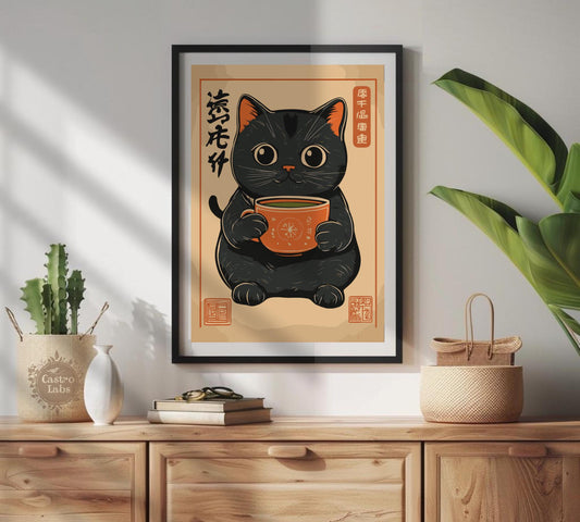 Affiche d'un joli chat noir buvant du matcha – Impression d'art d'inspiration japonaise