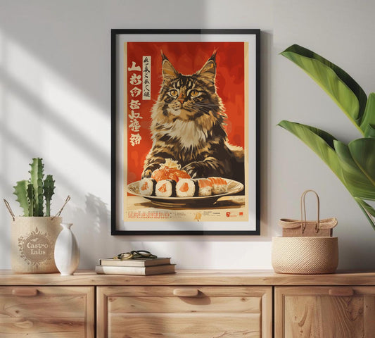 Affiche de sushis avec chat Maine Coon - Style japonais