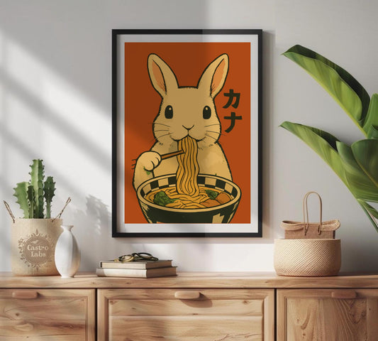 Affiche de lapin mangeant des ramen – Impression de ramen kawaii