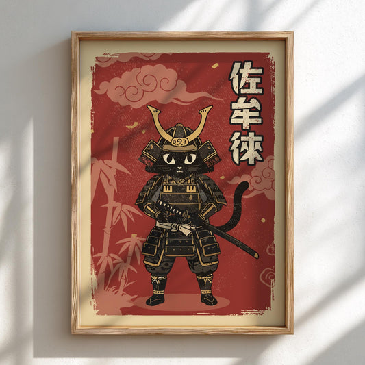 Samurai Cat Ukiyo-e Art Print – Décoration murale guerrier japonais
