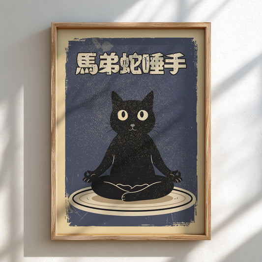 Impression d'art sur bois représentant un chat noir en méditation – Estampe japonaise zen ukiyo-e