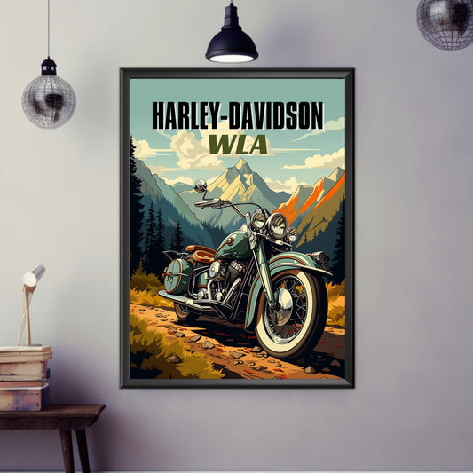 Affiche Harley-Davidson WLA – Décoration murale de moto militaire de la Seconde Guerre mondiale