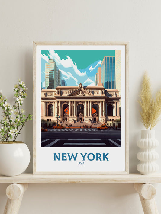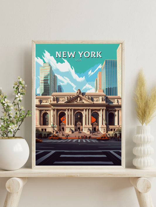 Affiche de voyage à New York - Œuvre d'art du bâtiment de la bibliothèque publique