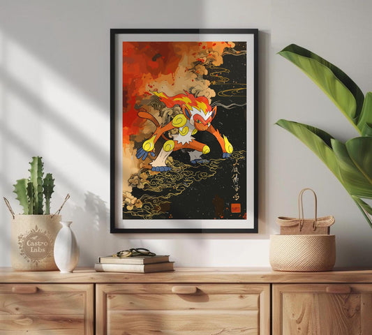 Affiche Pokémon Entei - Illustration de style tapisserie japonaise animée
