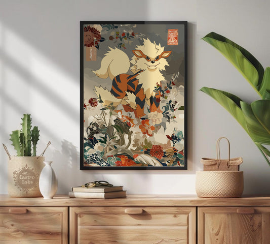 Tapisserie japonaise Arcanine - Affiche d'animation Pokémon et décoration murale relaxante