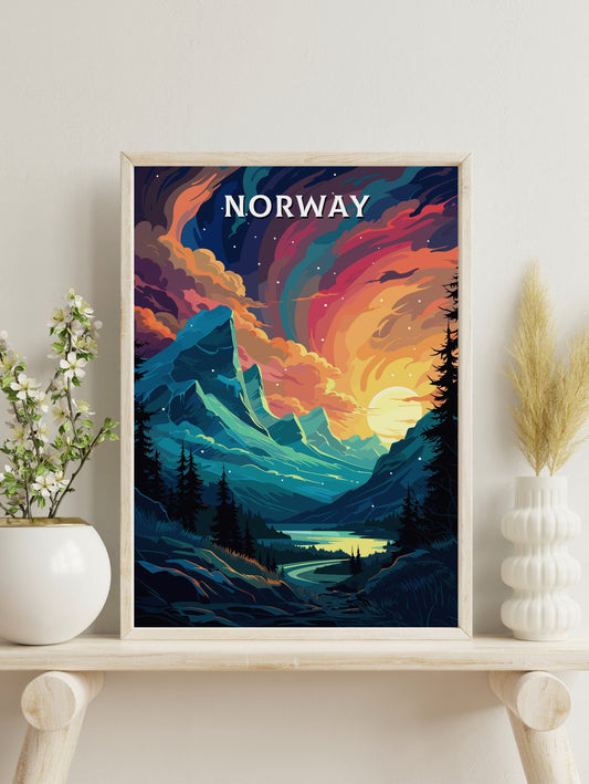 Affiche de voyage en Norvège - Illustration des aurores boréales