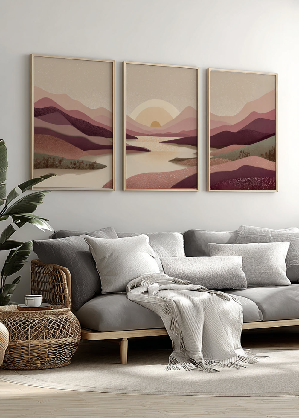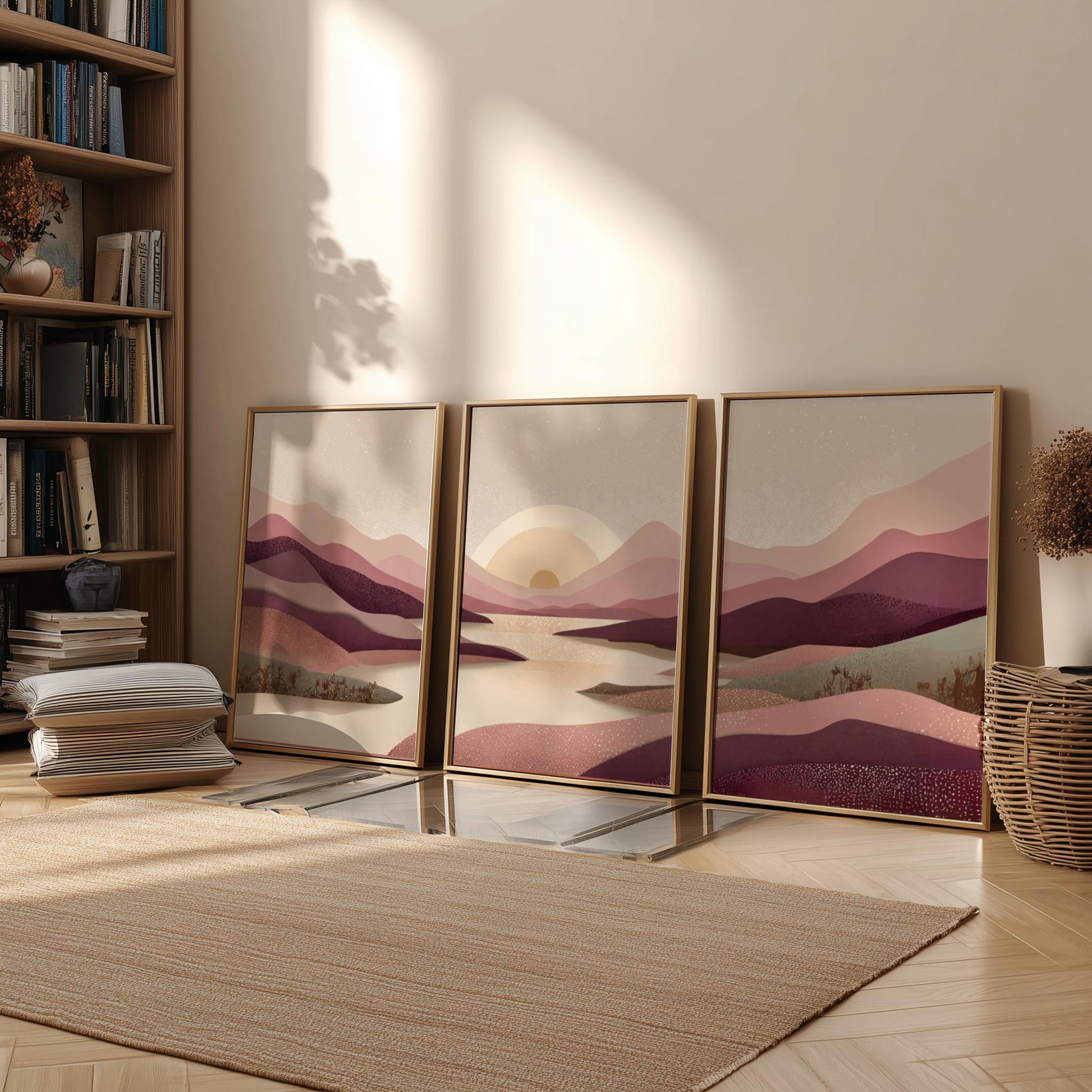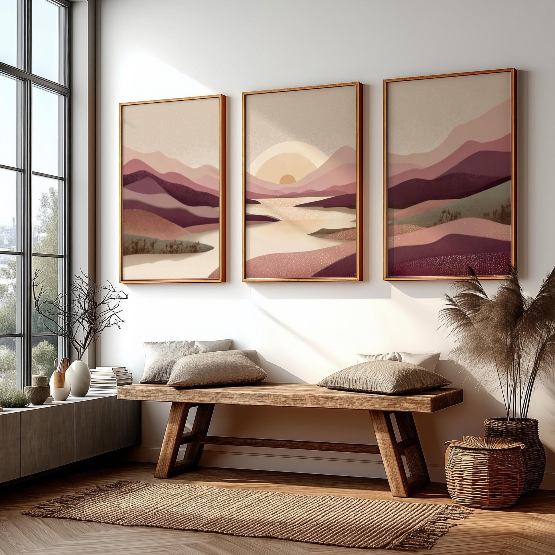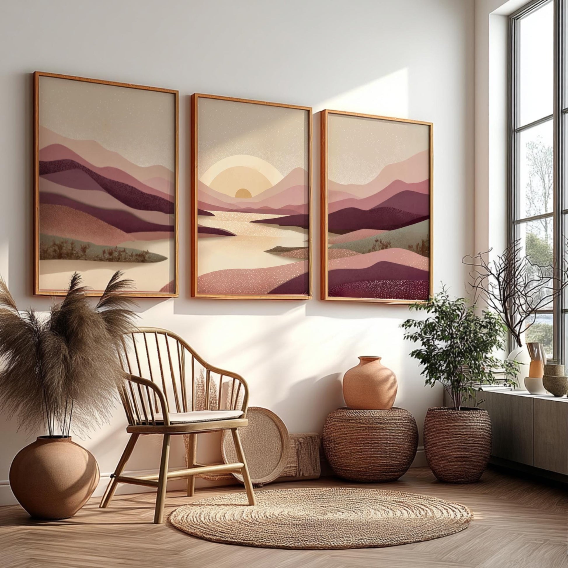 Lot de 3 impressions de paysages abstraits aux tons terreux – Décoration murale bohème moderne
