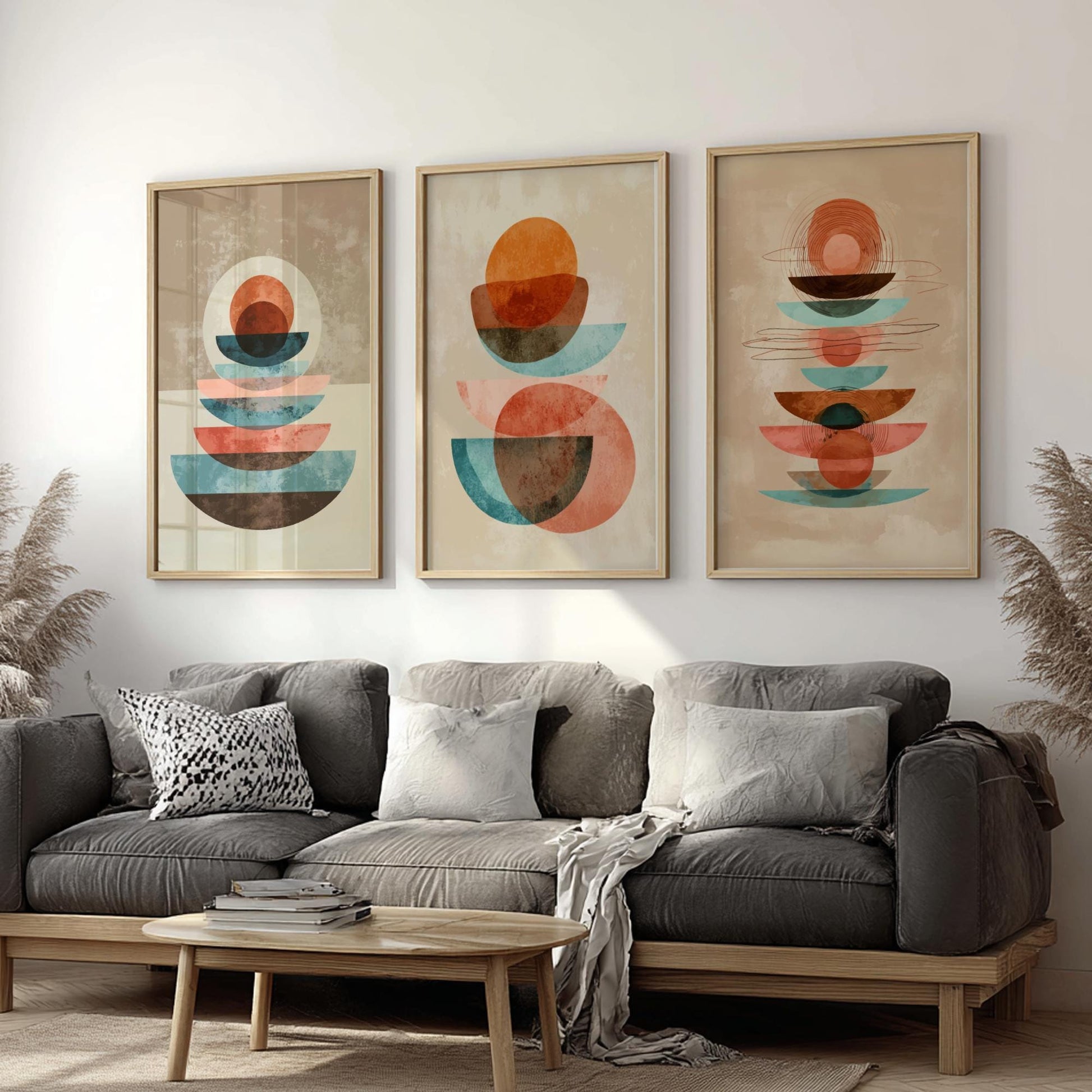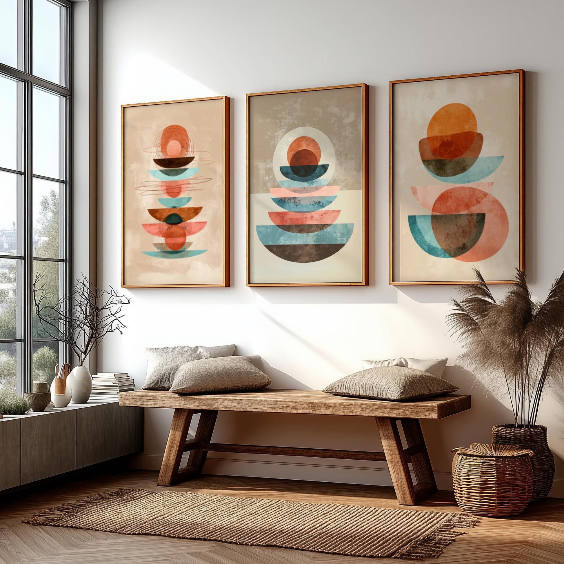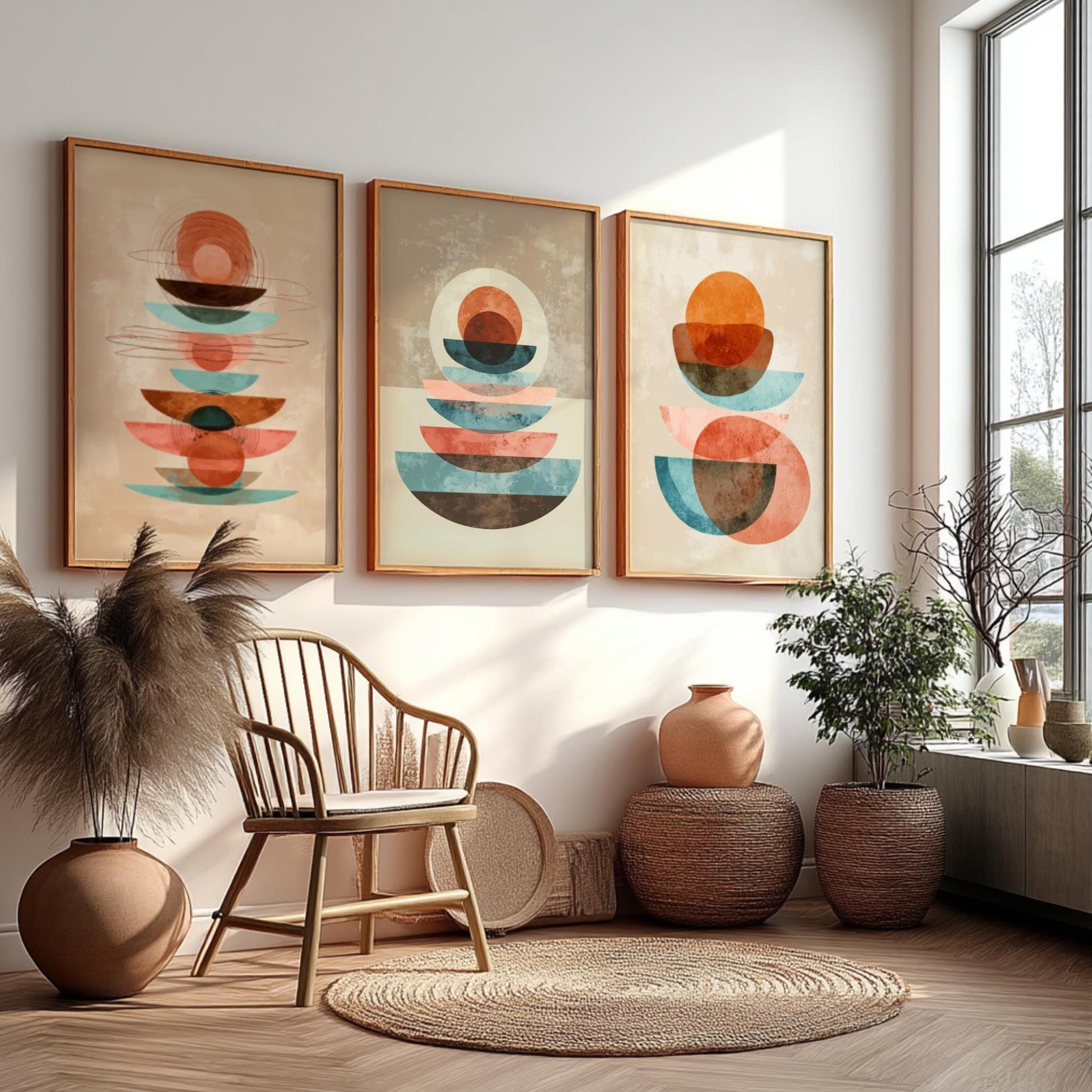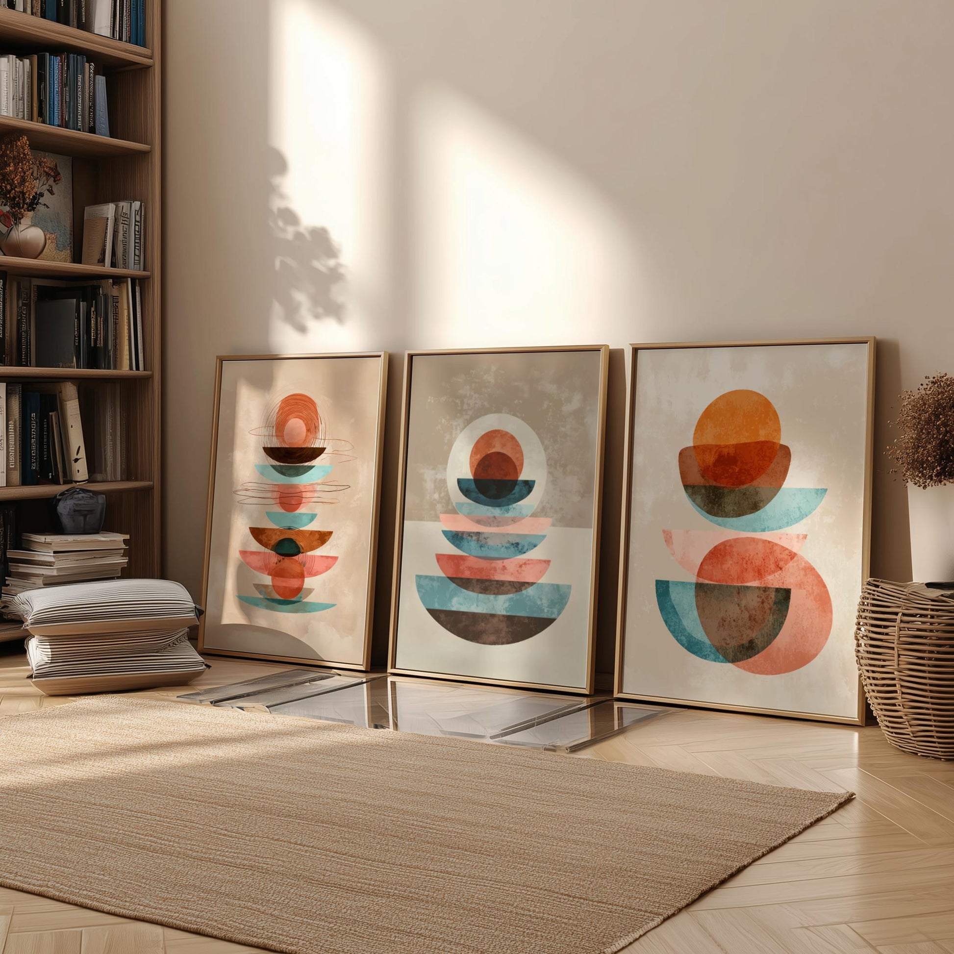 Art mural géométrique abstrait – Lot de 3 affiches modernes du milieu du siècle