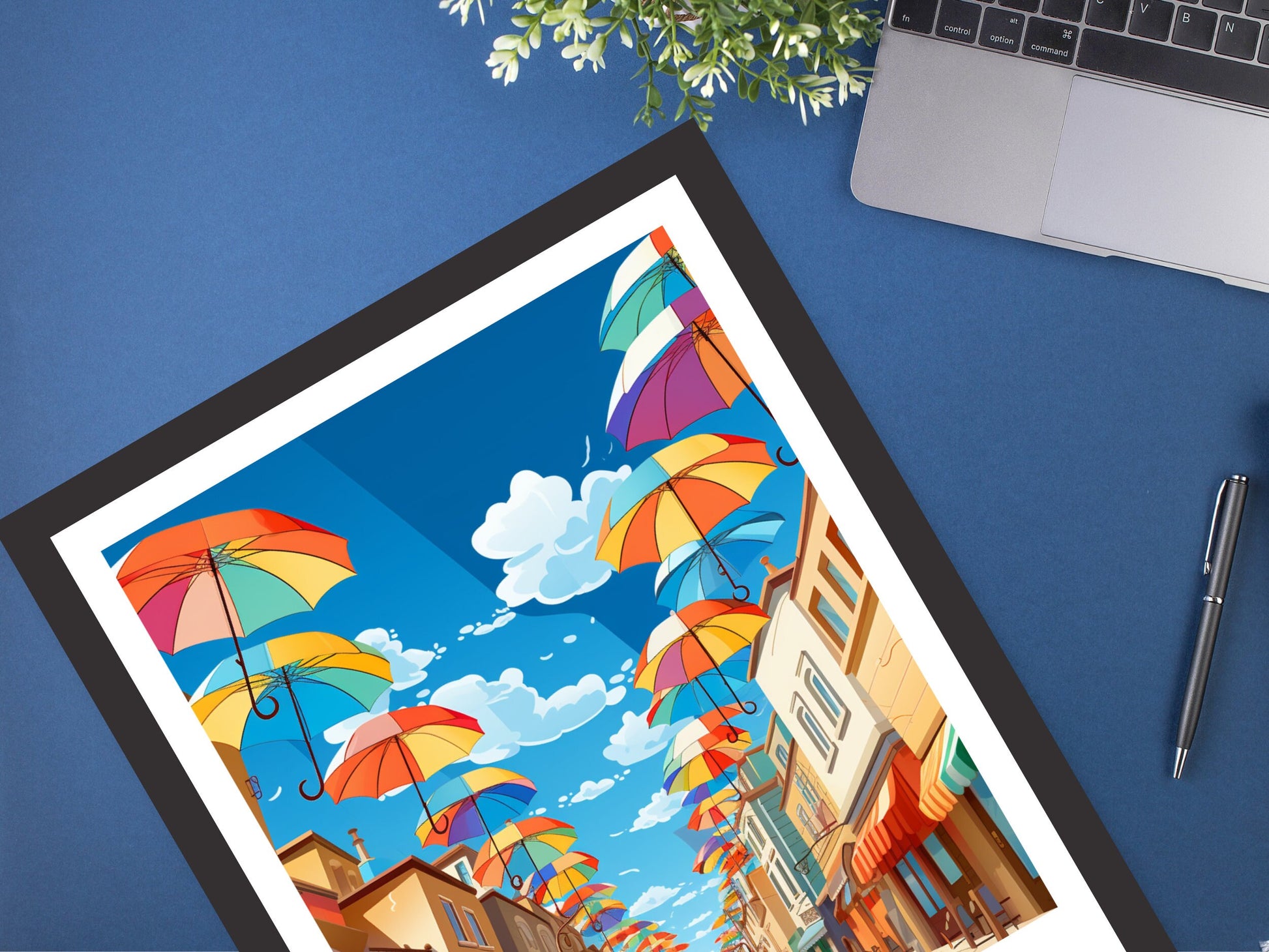 Illuminez votre espace avec le charme ludique de cette affiche de voyage d'Agueda , inspirée par l'une des villes les plus colorées du Portugal. Mettant en valeur les emblématiques parapluies flottants d'Agueda, ses rues animées et son ambiance festive, cette affiche capture l'atmosphère joyeuse et artistique de la ville.