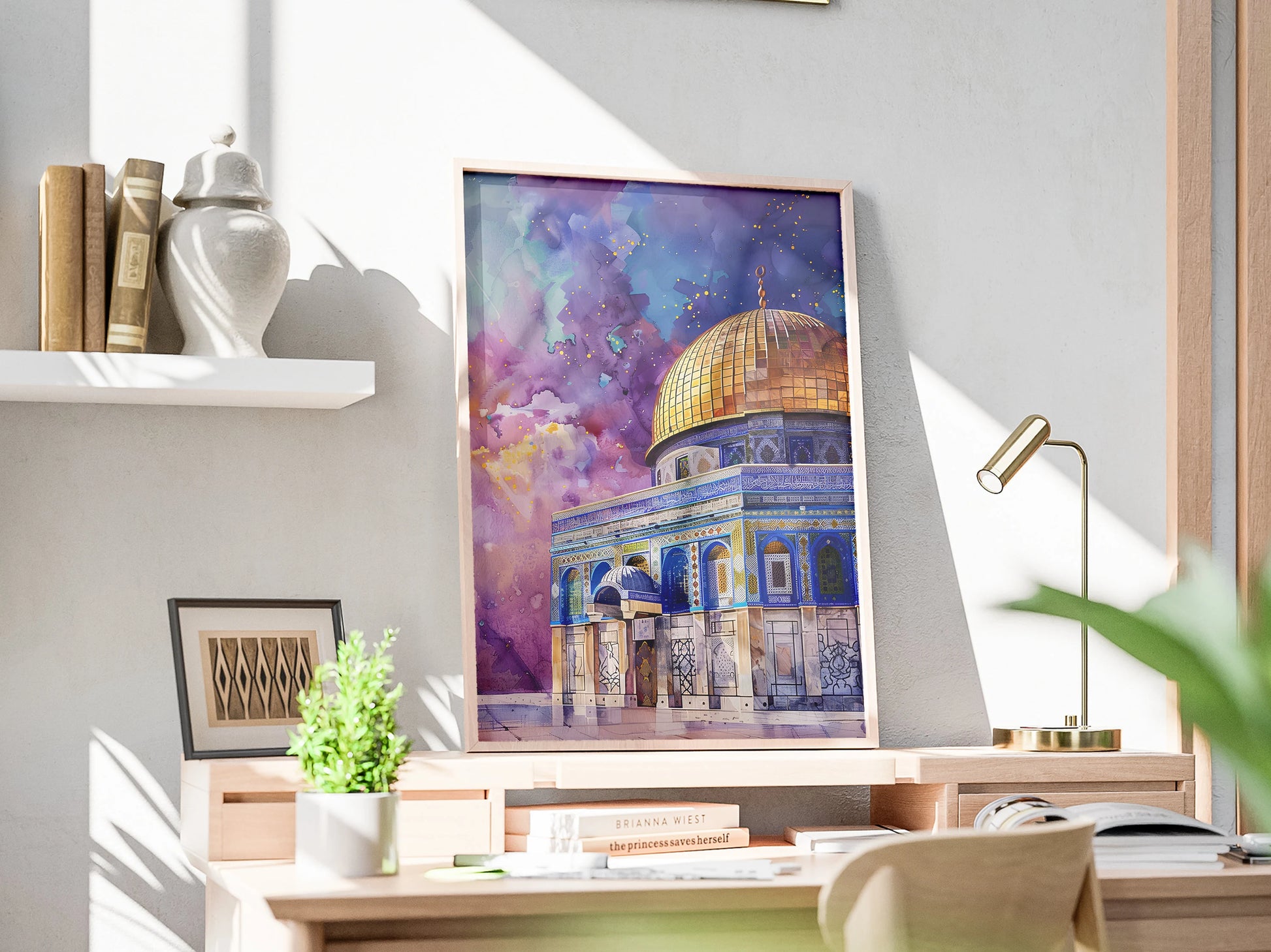 L' affiche de la mosquée Al-Aqsa et du Dôme du Rocher constitue également un cadeau attentionné pour les proches qui apprécient l'histoire islamique, l'art spirituel et les monuments de Jérusalem . Idéale pour une collection d'art islamique ou comme pièce maîtresse, cette affiche créera un point focal significatif dans votre intérieur.