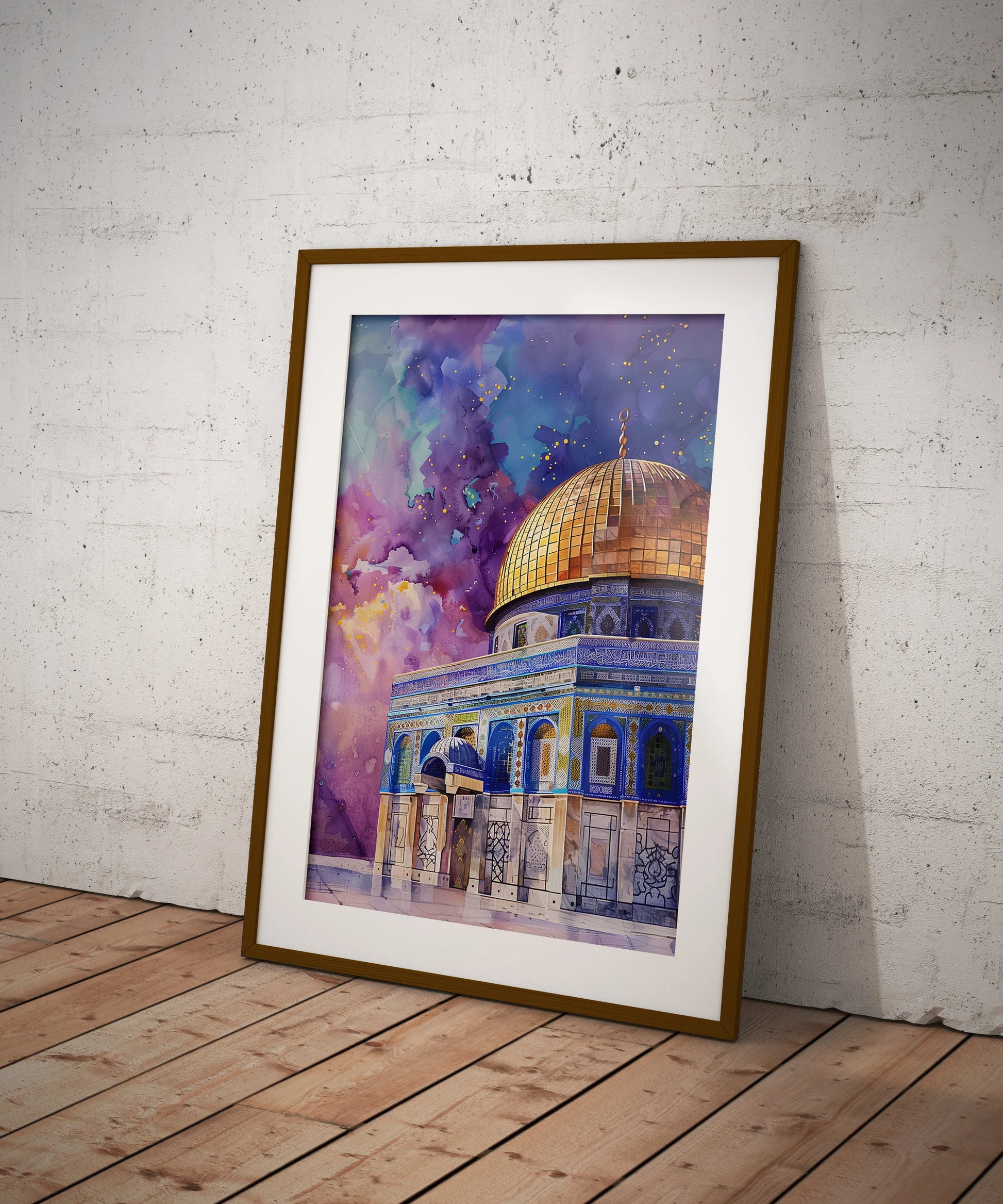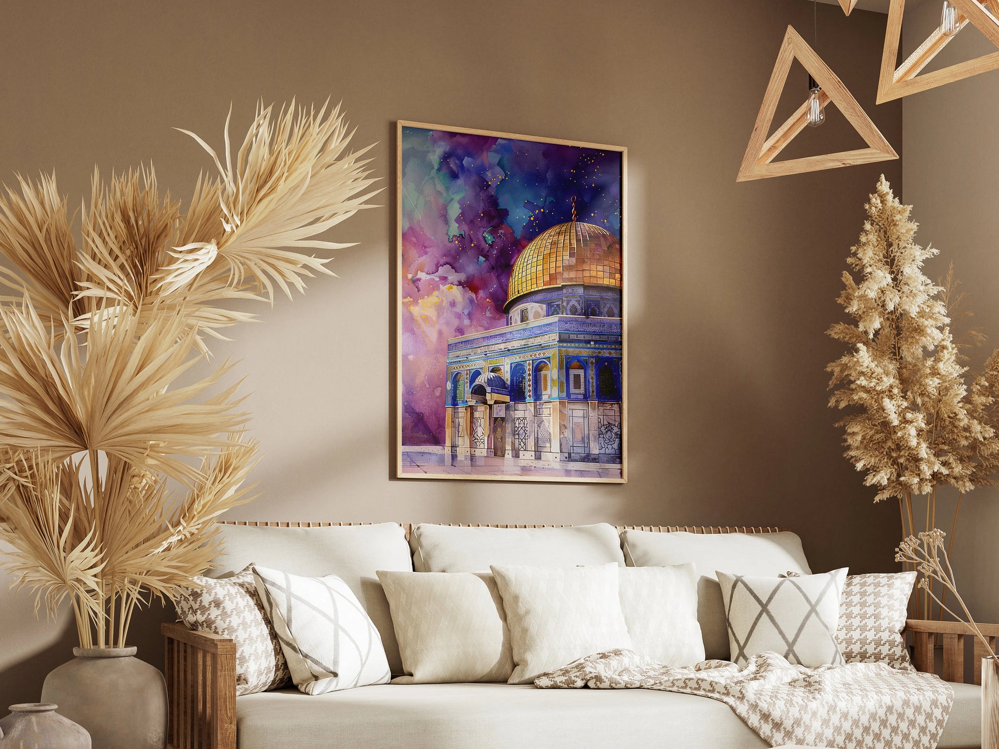 Célébrez la foi et l'histoire avec l' impression murale islamique de la mosquée Al-Aqsa – Dôme du Rocher, Jérusalem . Cette œuvre illustre magnifiquement deux des sites les plus emblématiques et sacrés de la Vieille Ville de Jérusalem, alliant beauté architecturale et profonde signification spirituelle.