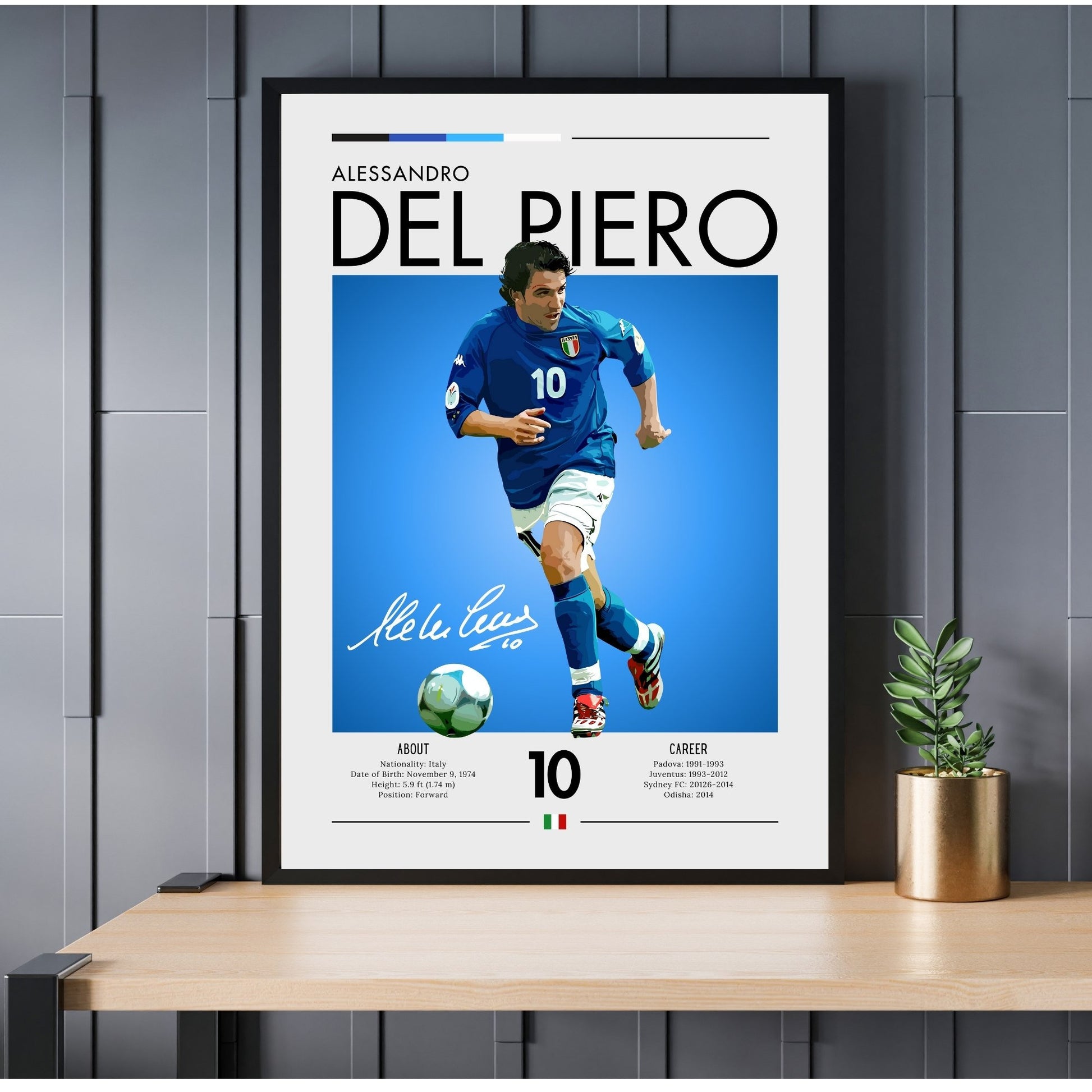 Rendez hommage à l'élégance et à l'héritage d' Alessandro Del Piero avec cette superbe affiche de football signée Brighton Posters. Mettant en vedette la légende de la Juventus et de l'Italie dans un design dynamique, cette affiche Del Piero capture la classe, la créativité et le leadership qui ont fait de lui une icône mondiale.