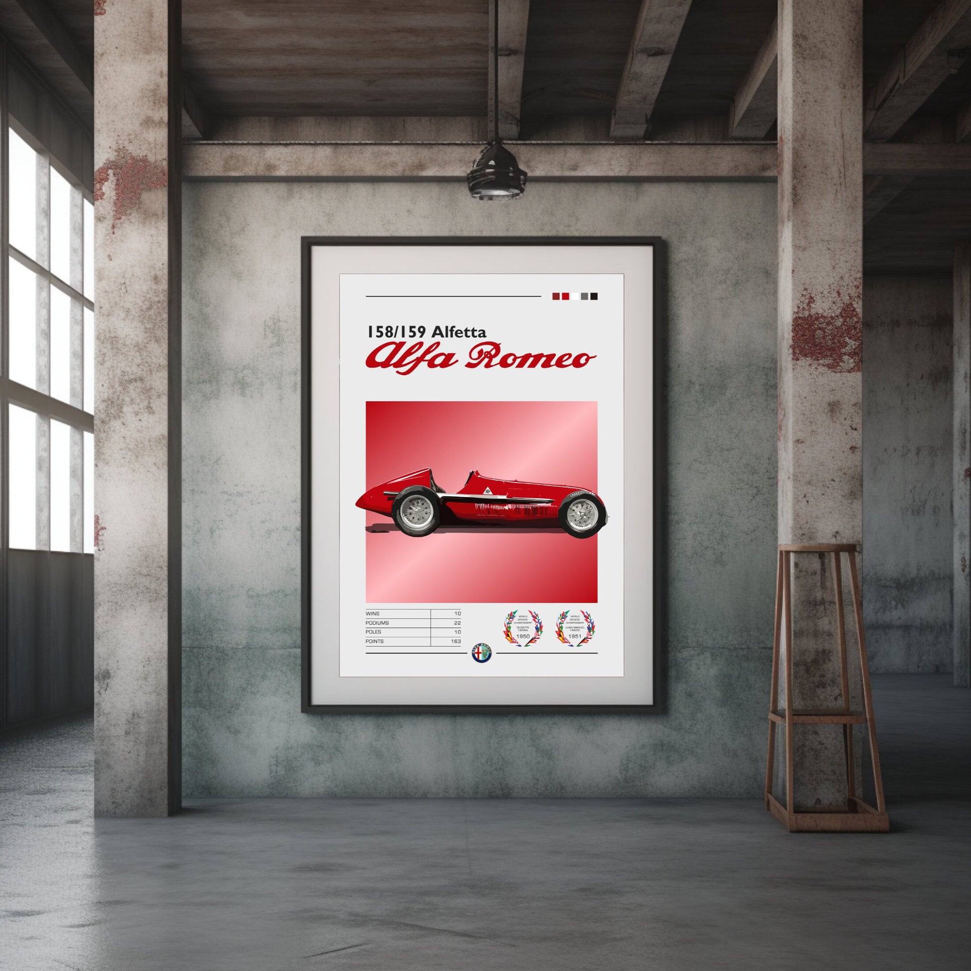 Cadeau idéal pour les passionnés de sport automobile vintage, les affiches classiques de F1 , comme cette Alfa Romeo 158 Alfetta, célèbrent le frisson et l'élégance des débuts de la Formule 1. Sublimez votre décoration murale avec l' affiche Alfa Romeo 158 Alfetta F1 – Fangio & Farina Classic Art et revivez la vitesse, l'habileté et le prestige de l'ère pionnière de la F1.