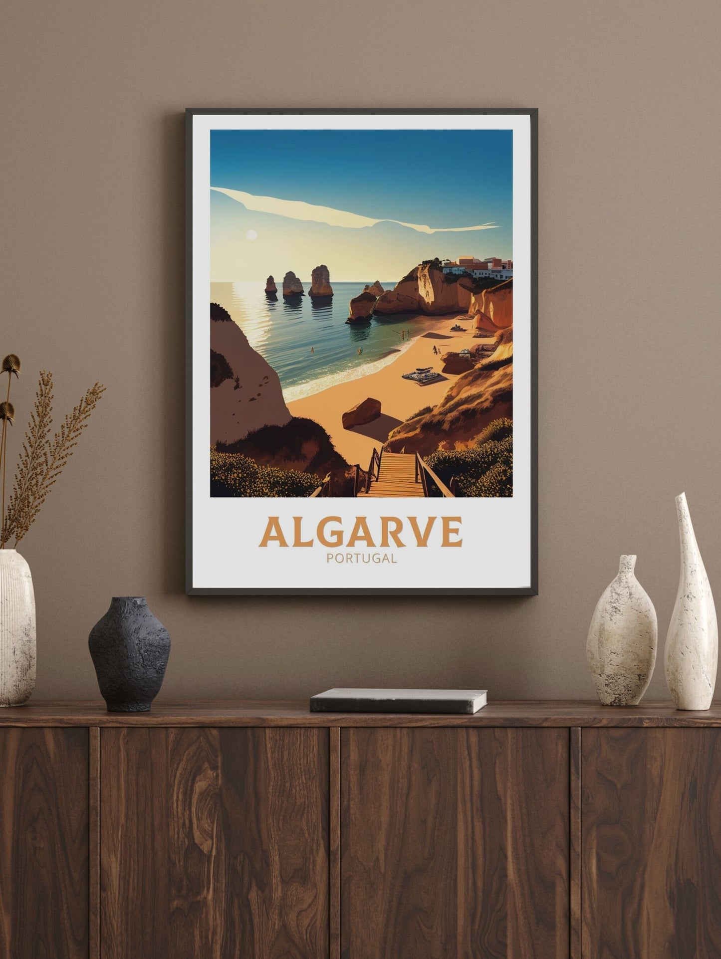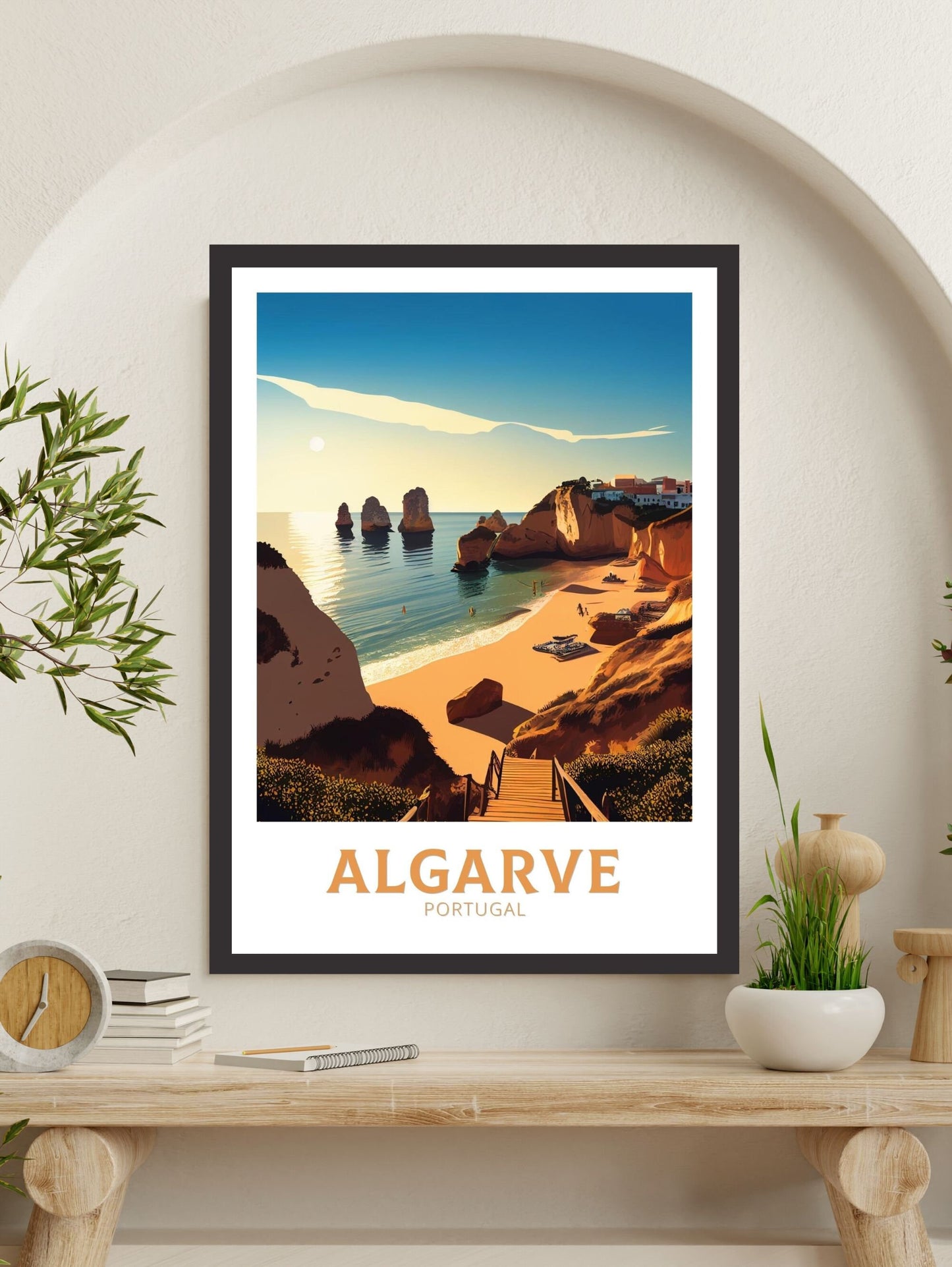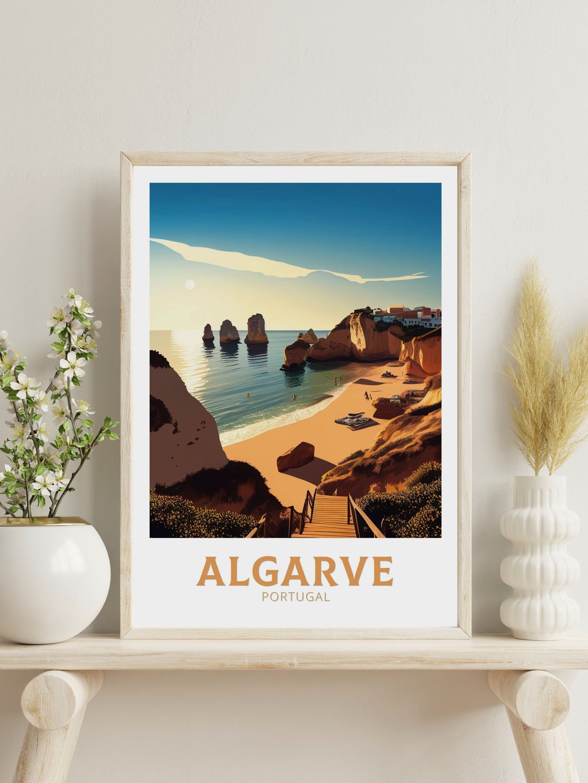 Ajoutez une touche de charme côtier à vos murs avec cette œuvre d'art de voyage inspirée de l'Algarve.