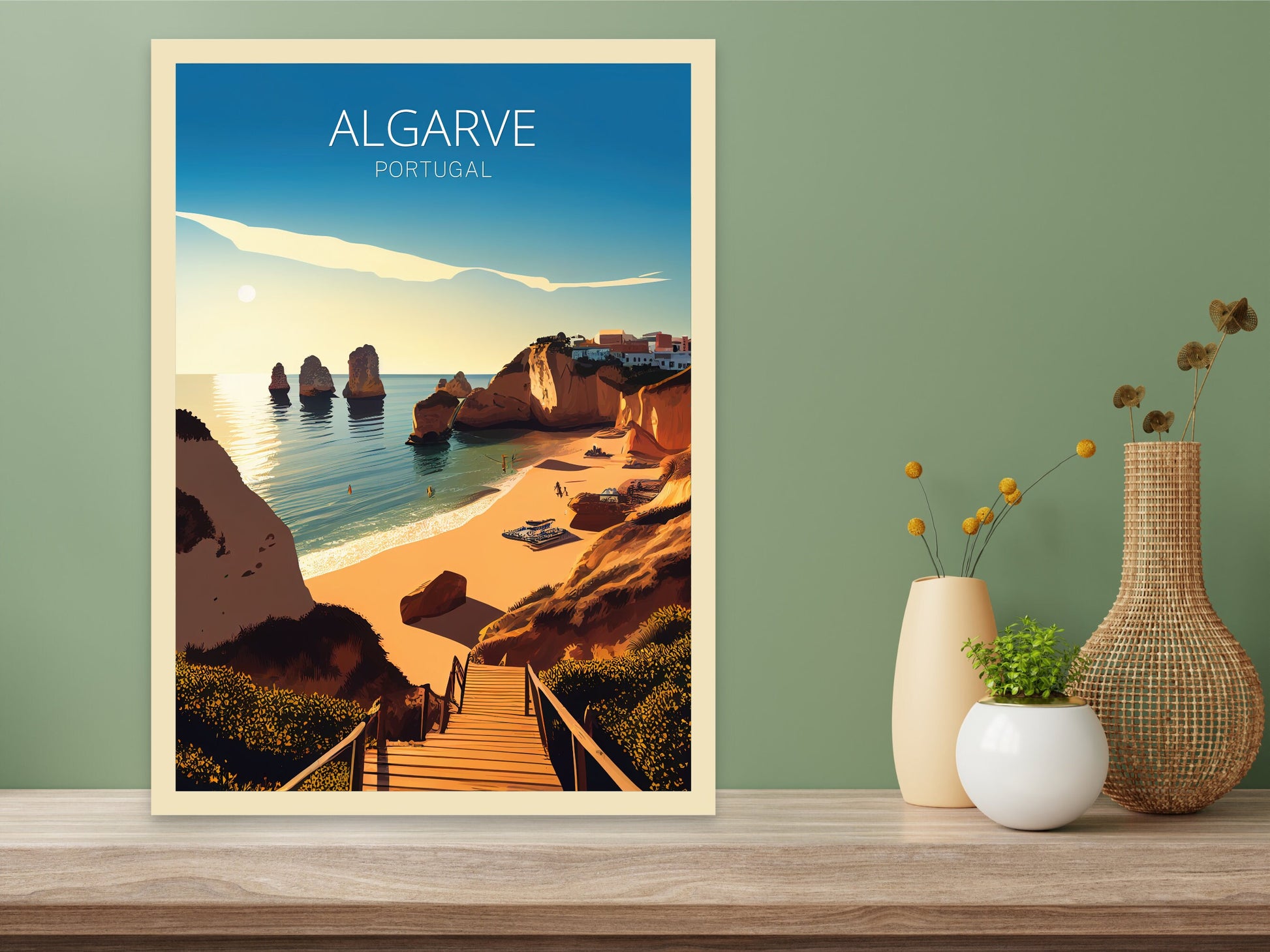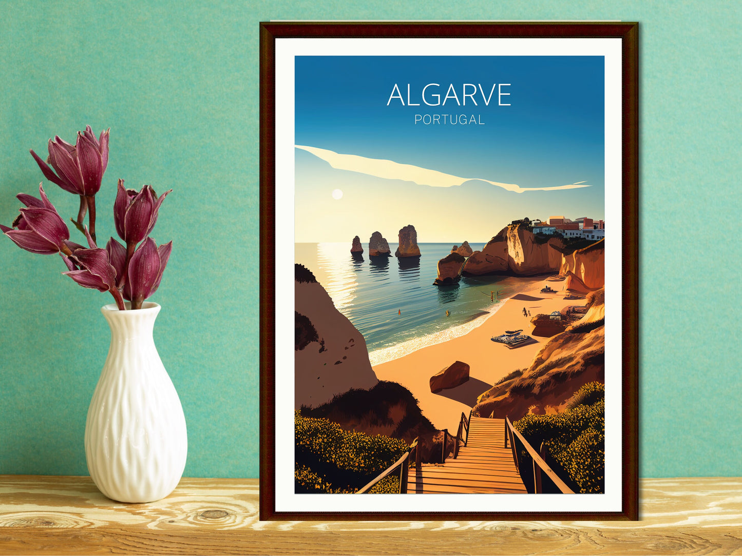 Capturez le littoral doré et les eaux cristallines du sud du Portugal avec cette superbe affiche de voyage sur l'Algarve . Avec ses falaises emblématiques, ses plages ensoleillées et ses charmants villages de pêcheurs, cette œuvre reflète à merveille l'esprit décontracté du littoral de l'Algarve.