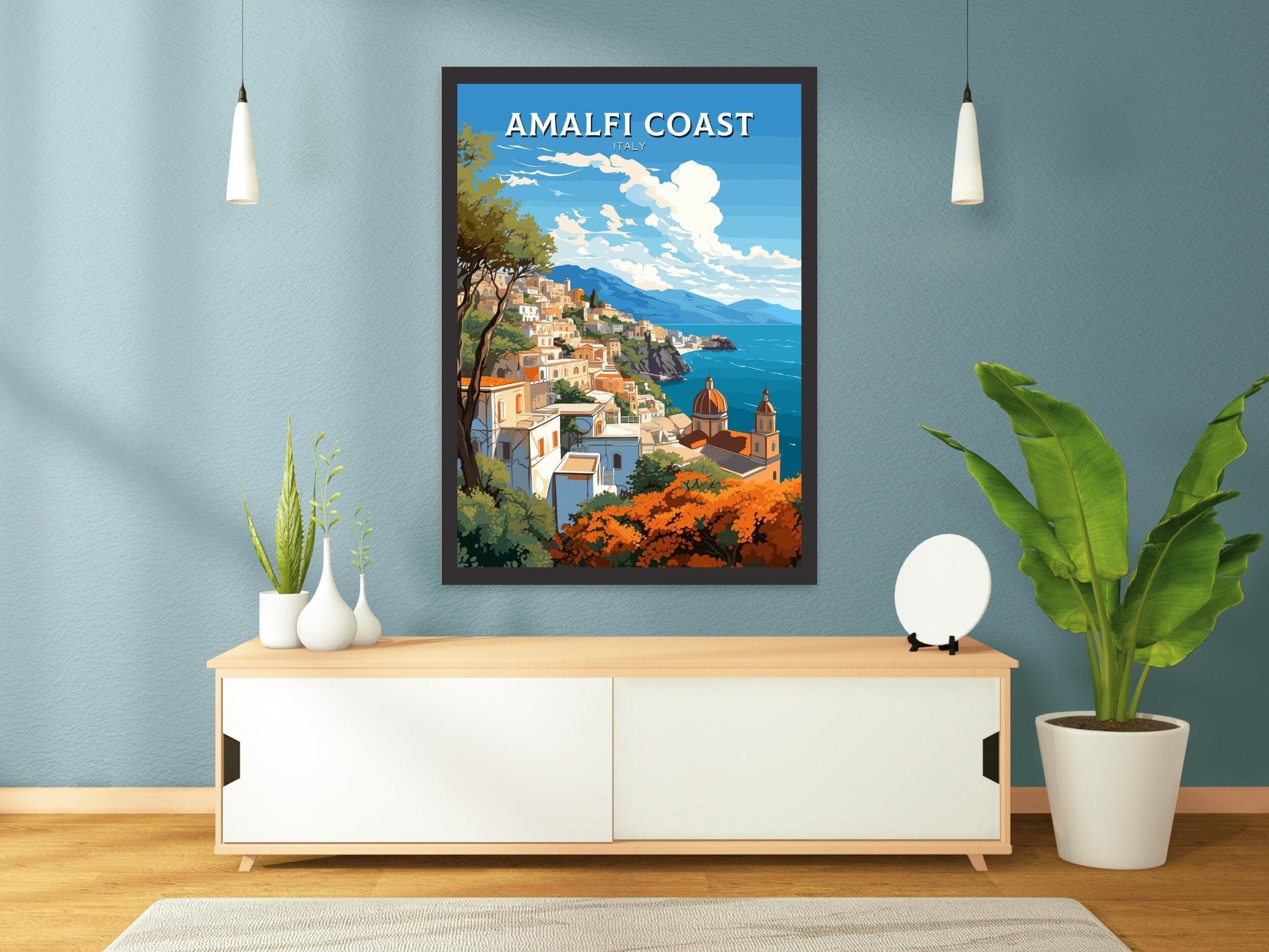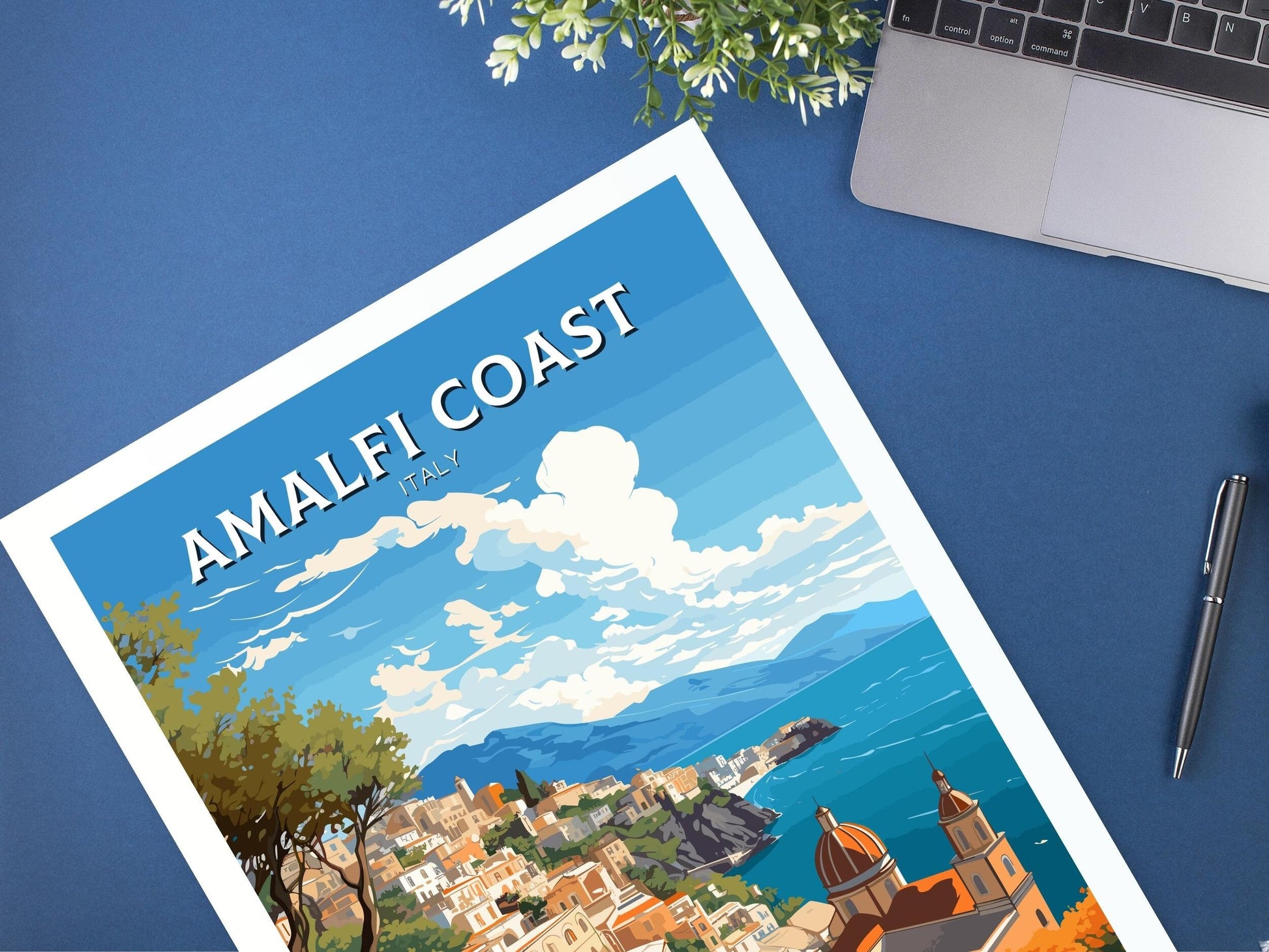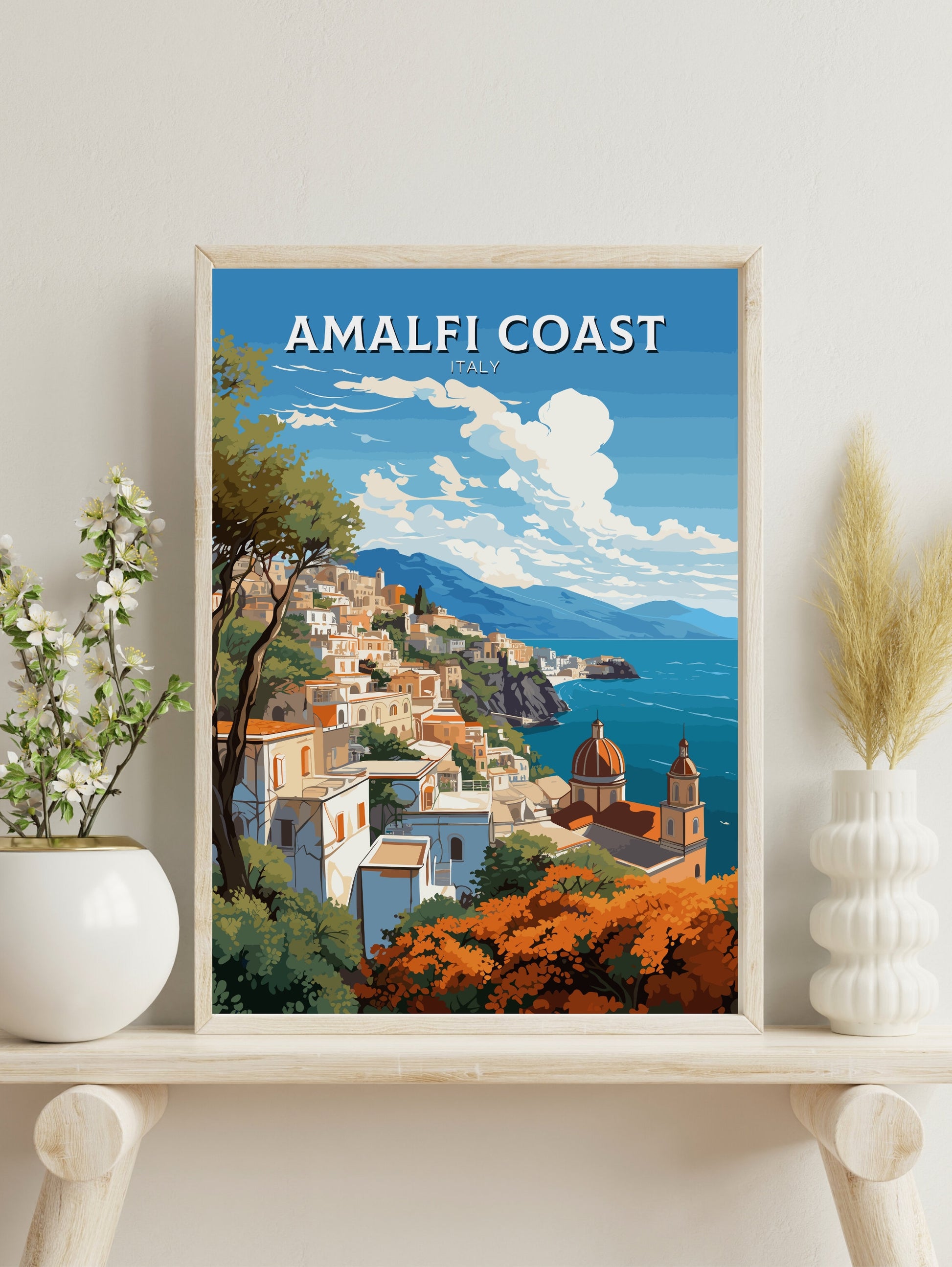 Capturez la beauté époustouflante du sud de l'Italie avec cette élégante affiche de voyage de la côte amalfitaine . Avec ses villages aux couleurs pastel à flanc de falaise, ses eaux turquoise et ses routes côtières emblématiques, cette œuvre vous transporte au cœur de la côte amalfitaine.
