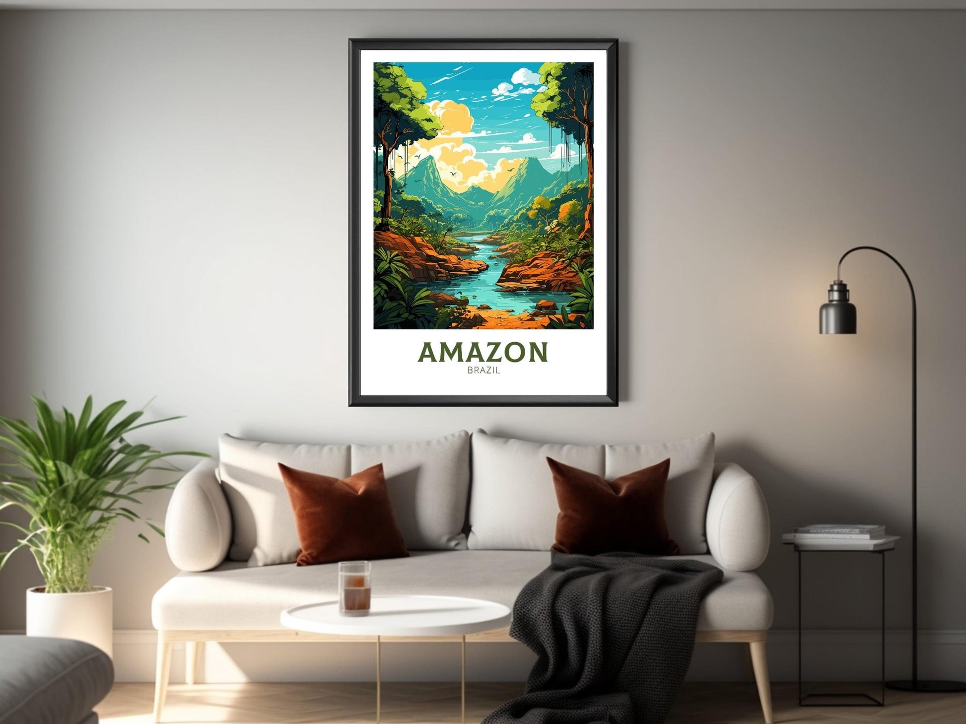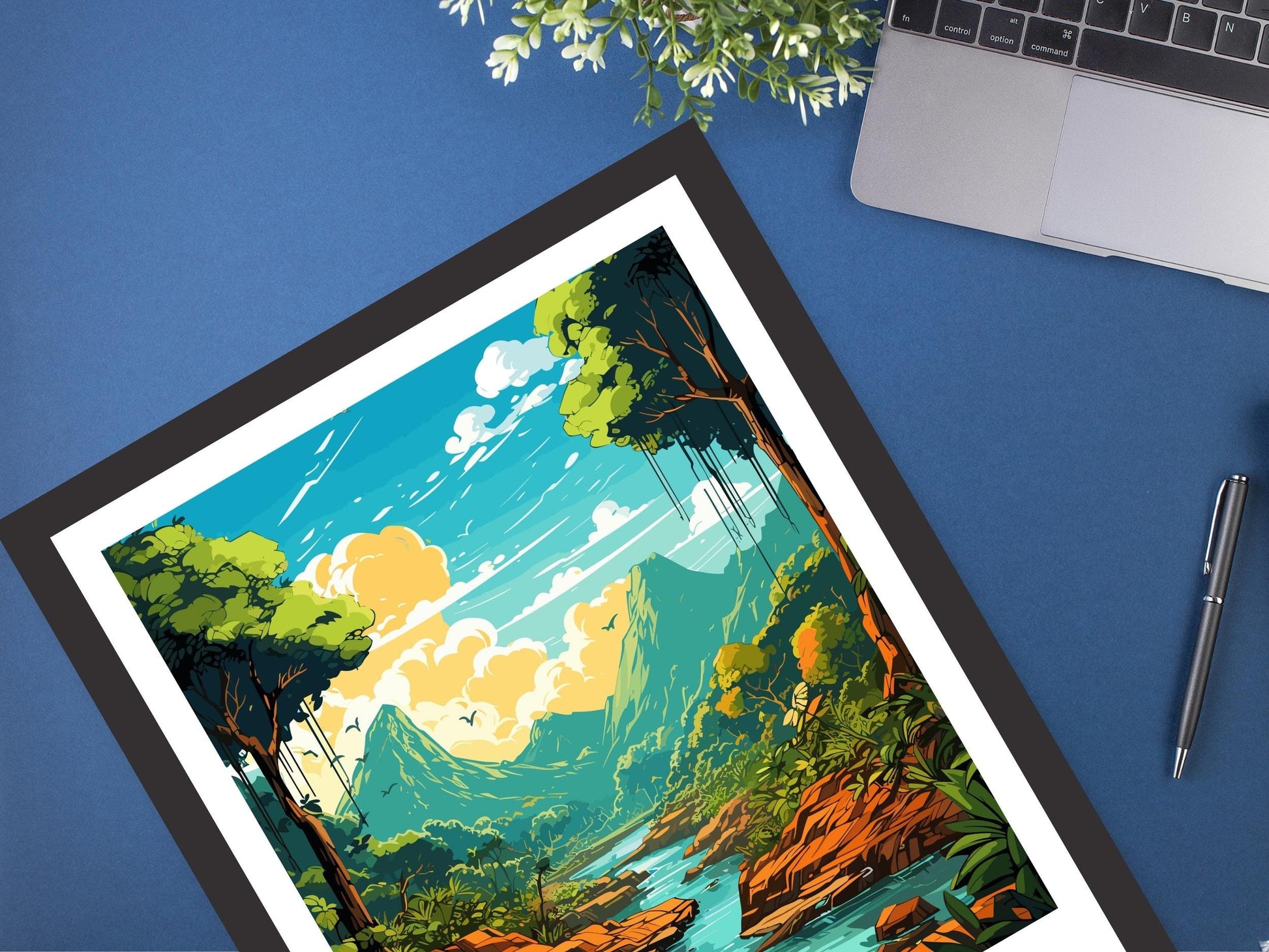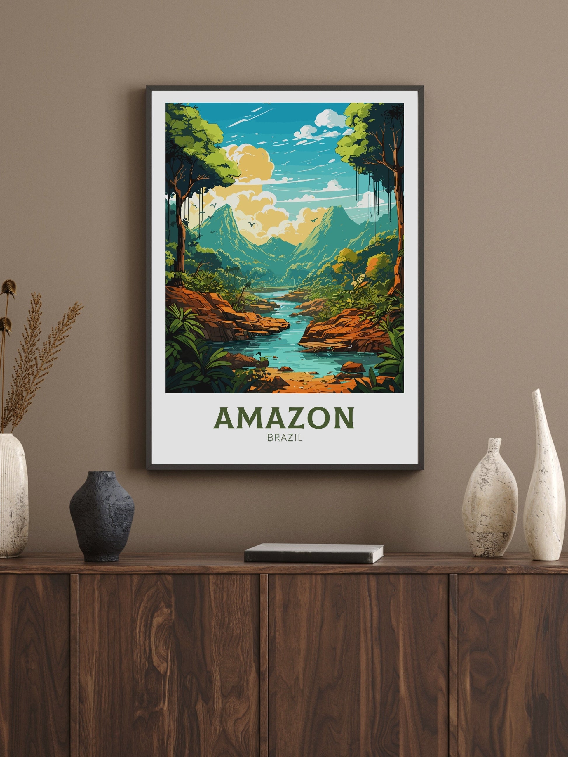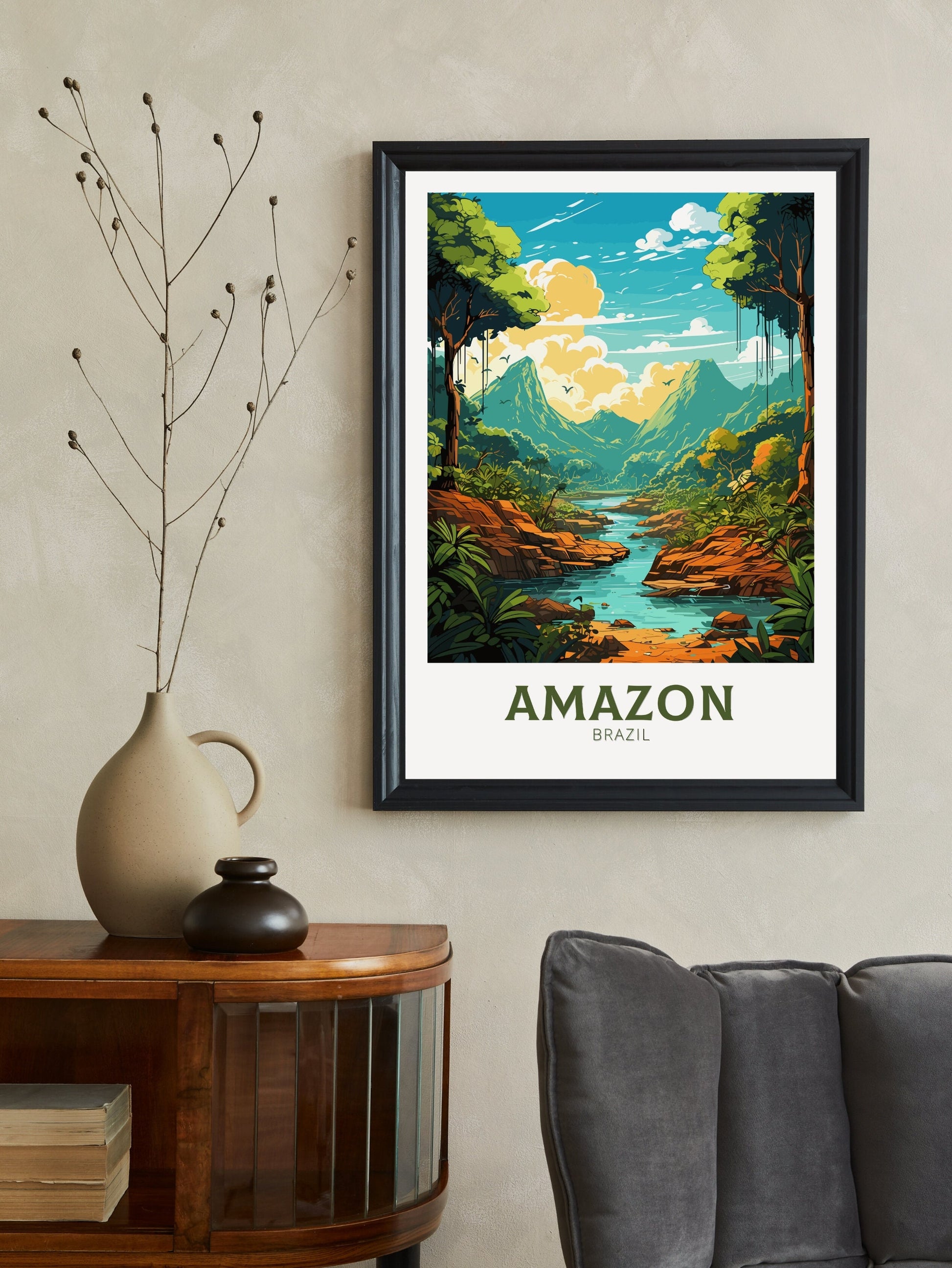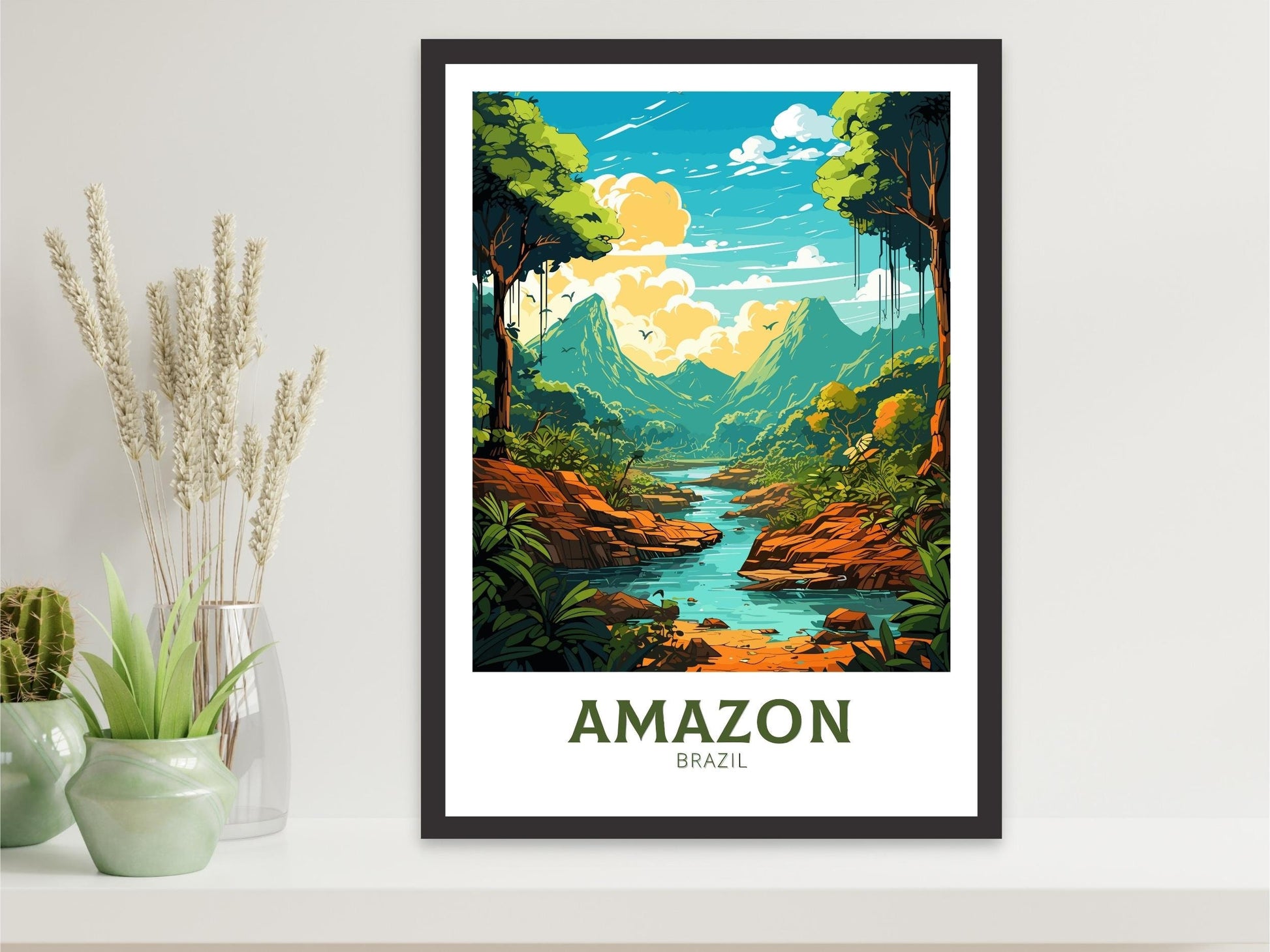 Cette reproduction d'art de la forêt amazonienne apporte la vitalité et la magie de la jungle à votre intérieur. Les détails complexes du feuillage dense, des arbres imposants et de la faune vibrante font de cette œuvre une représentation saisissante de l'un des écosystèmes les plus fascinants de la planète.