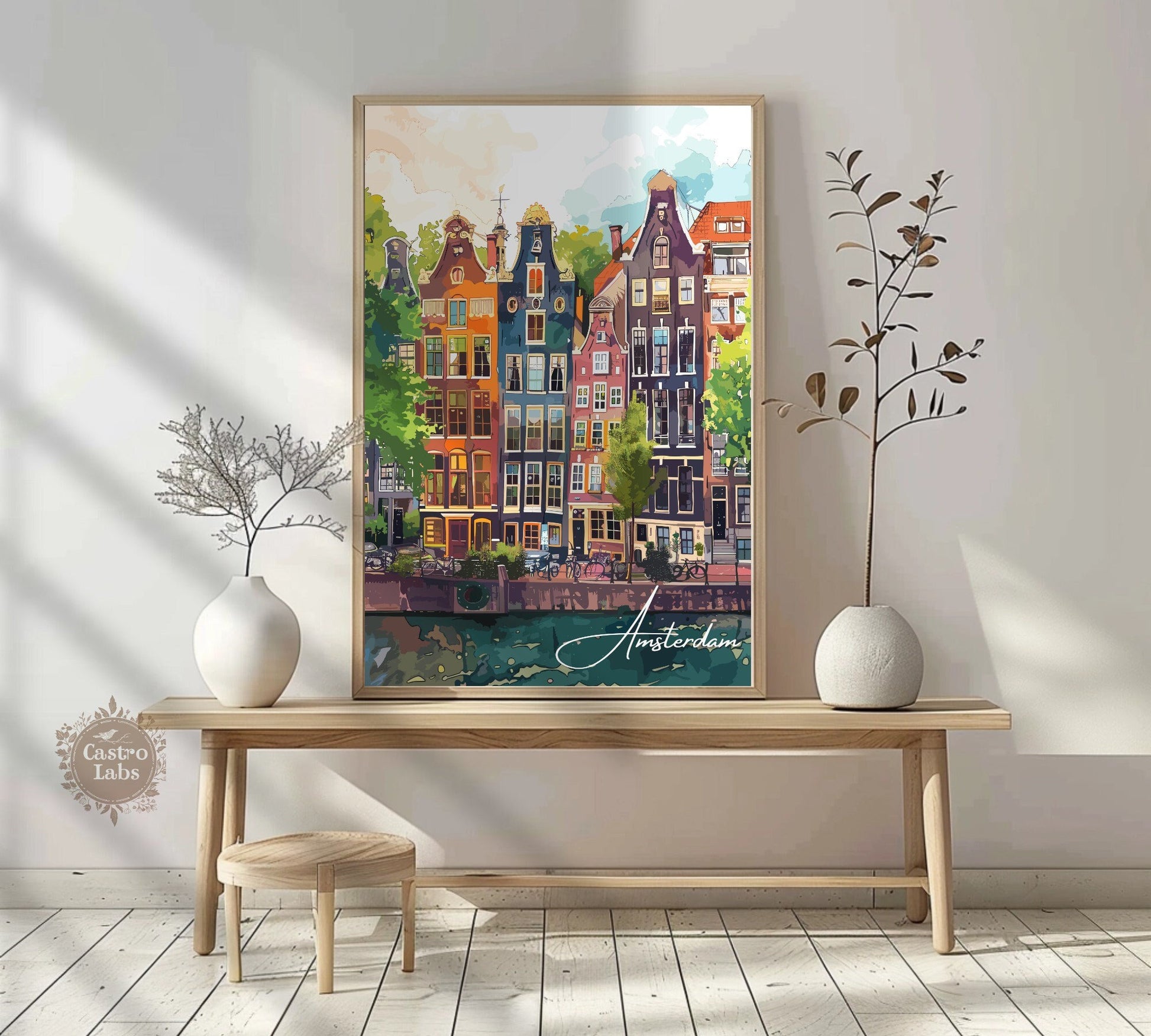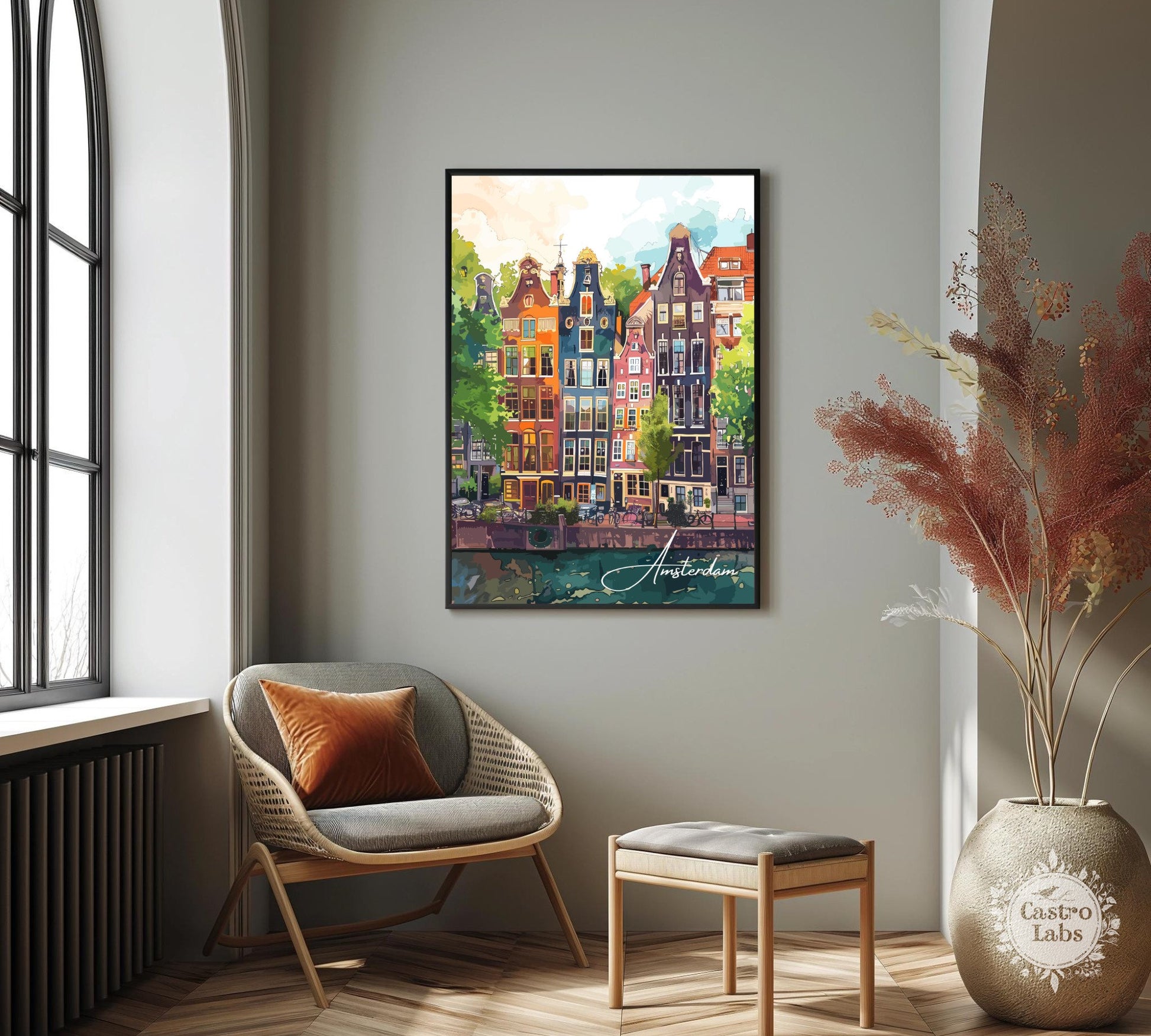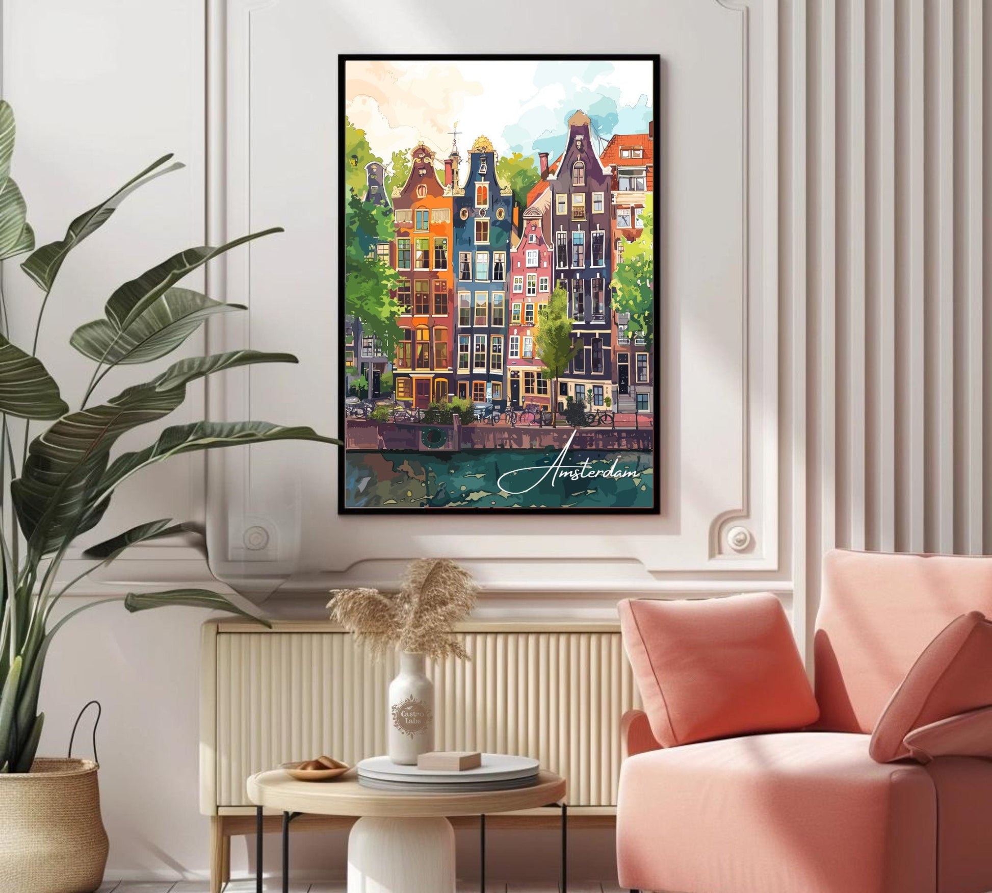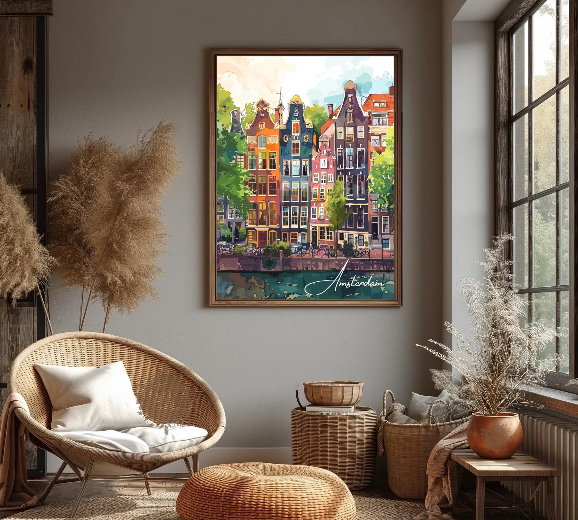 Apportez le charme intemporel des maisons d'Amsterdam dans votre maison avec cette exquise affiche aquarelle.