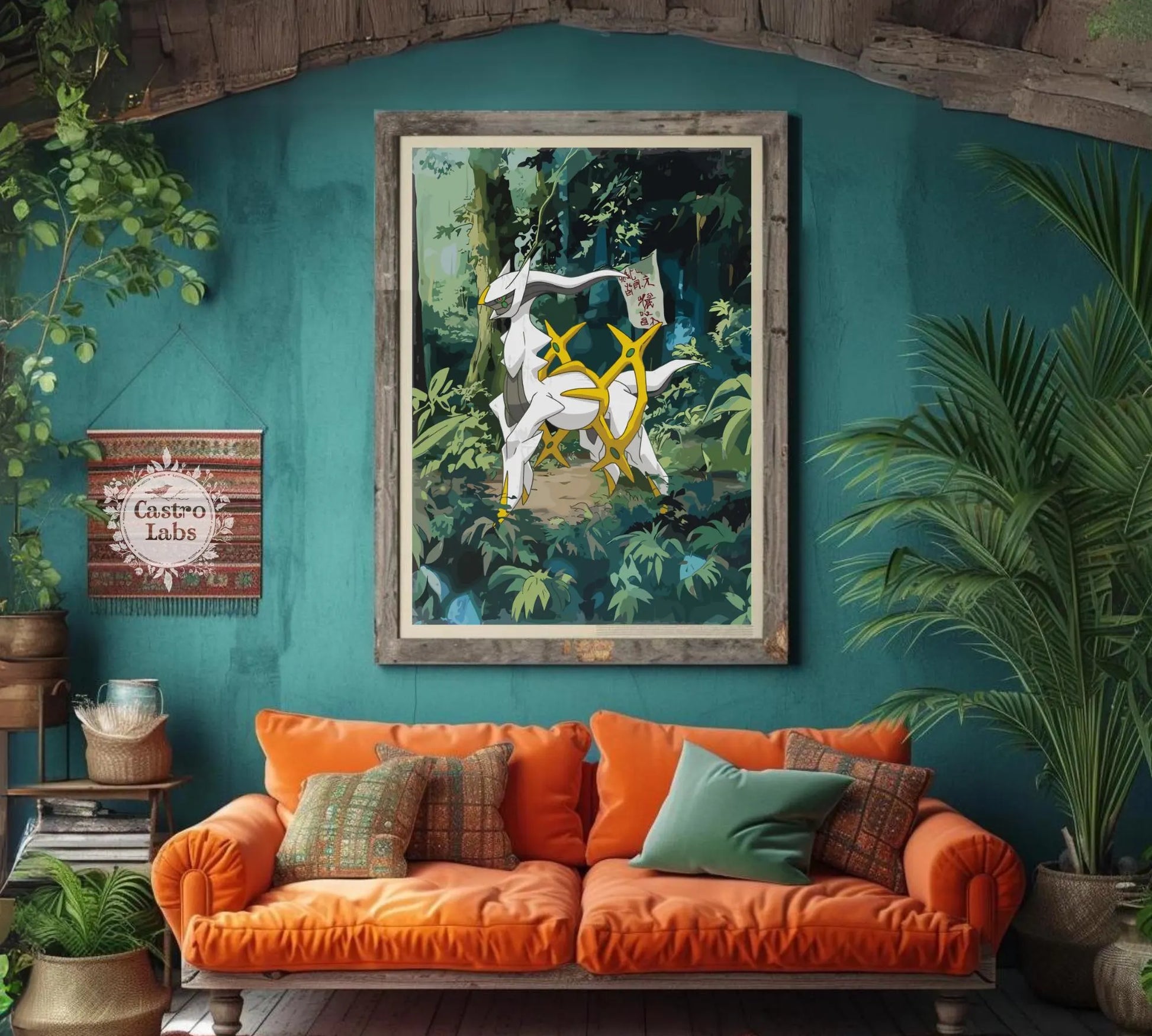 Célébrez le dieu Pokémon avec le poster Arceus , une décoration murale de style japonais inspirée de la légendaire carte Arceus du JCC Pokémon. Conçu avec des lignes audacieuses et une touche japonaise traditionnelle, ce poster capture l'aura divine et puissante d'Arceus, ce qui en fait une pièce emblématique pour tout fan ou collectionneur de Pokémon.