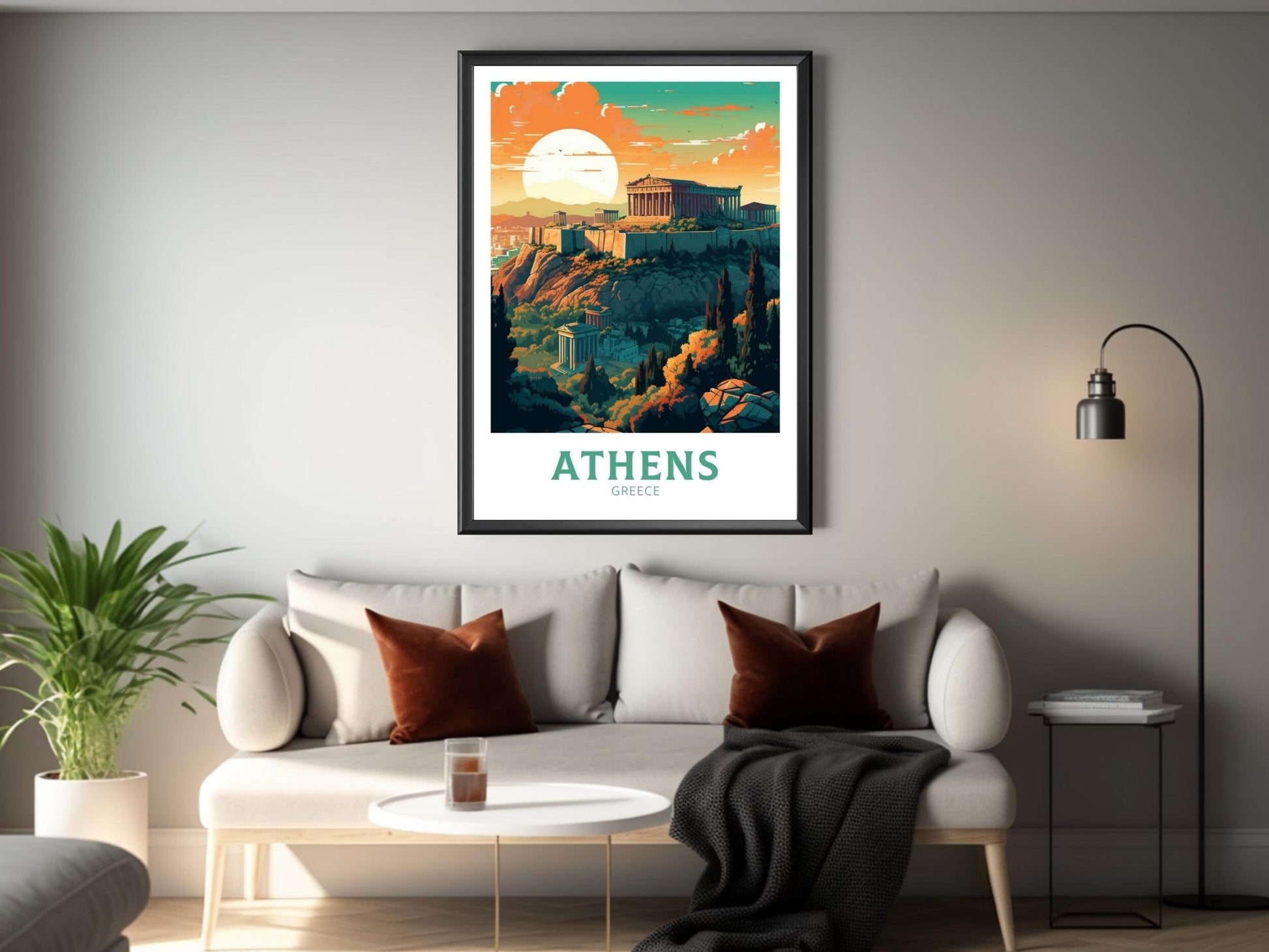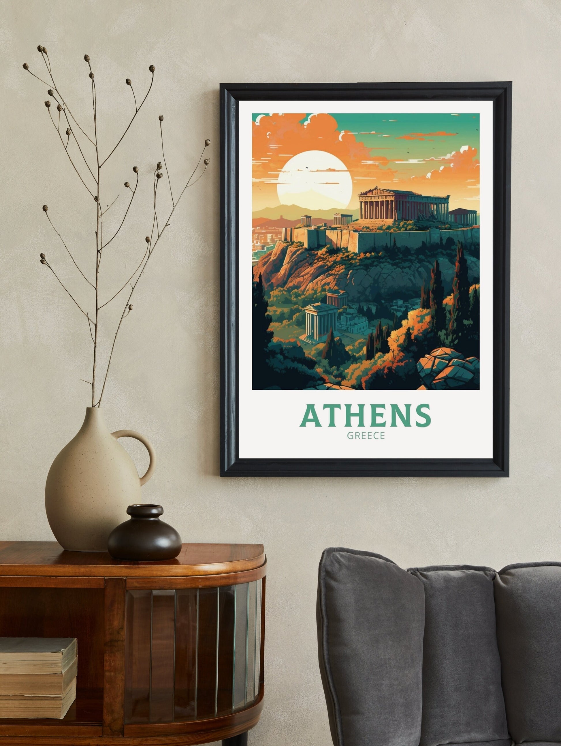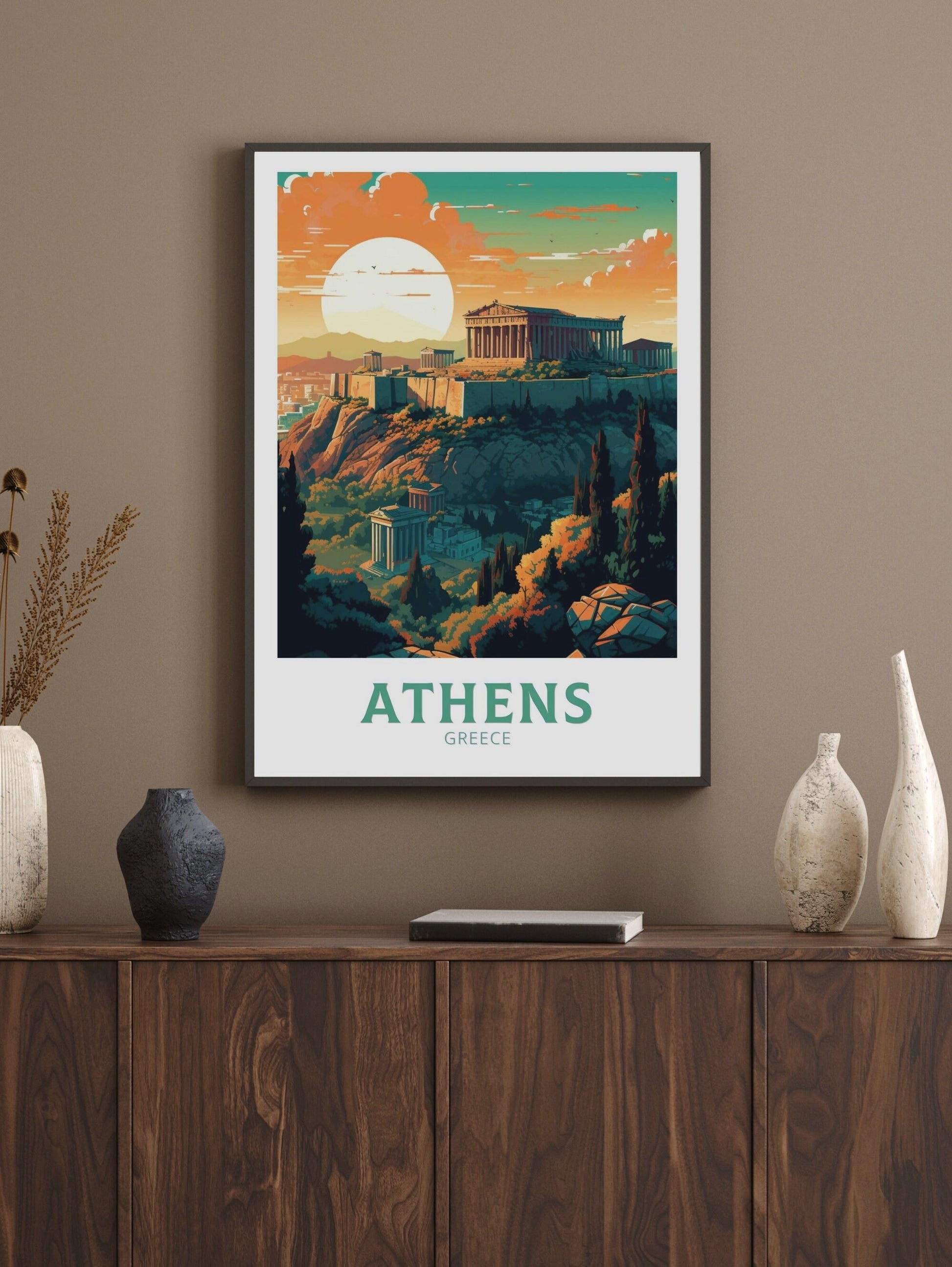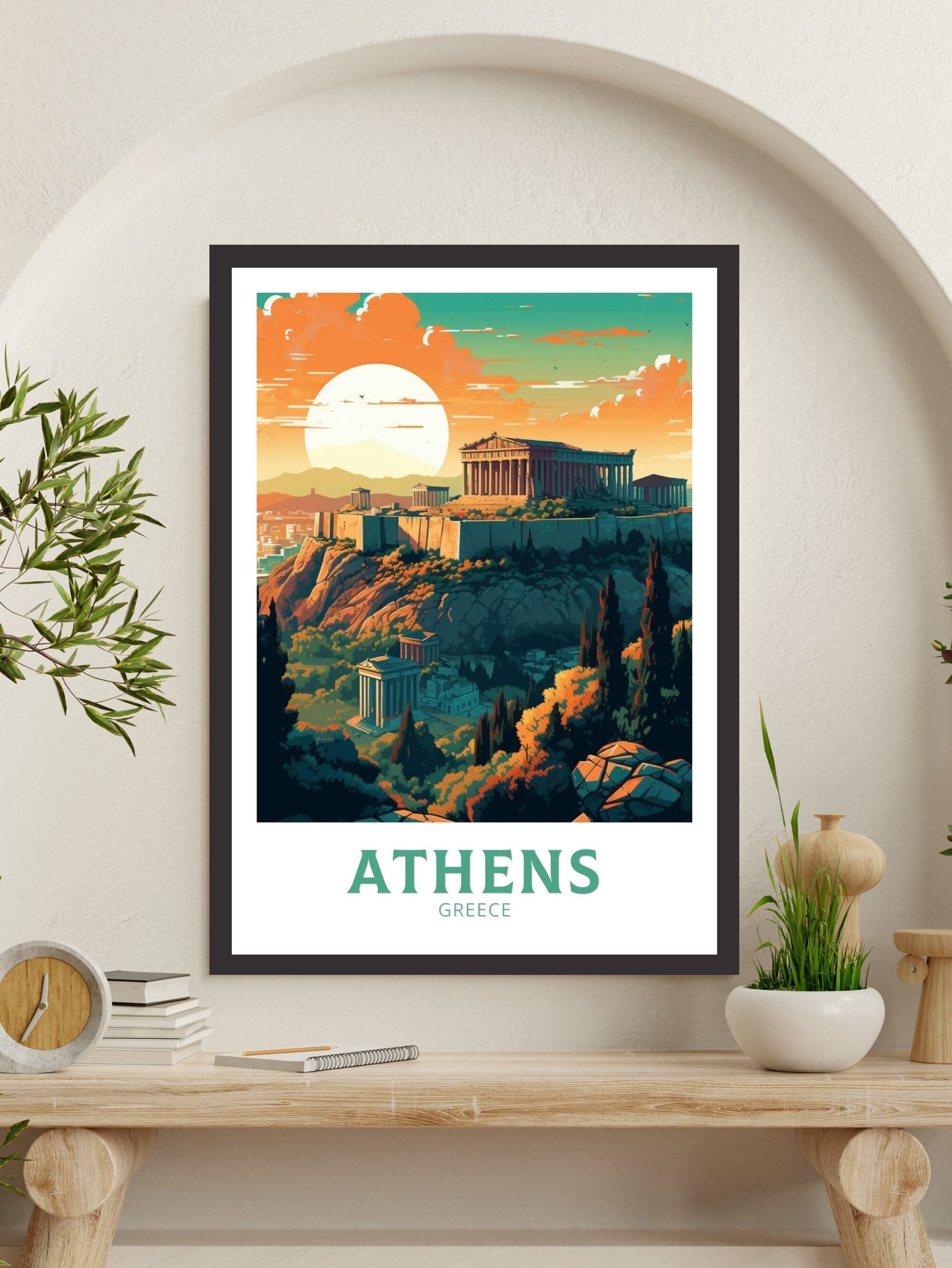 Plongez dans la riche histoire et la culture de la Grèce avec cette superbe œuvre d'art de voyage sur Athènes . Mettant en vedette des sites emblématiques comme l'Acropole et des temples antiques, cette œuvre capture avec brio le charme intemporel d'Athènes.