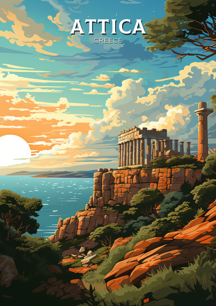 Célébrez le riche patrimoine de l'Attique, région grecque, avec cette superbe affiche de voyage . Présentant de magnifiques paysages, des monuments historiques et des éléments culturels dynamiques, cette œuvre capture l'essence même de cette région emblématique.