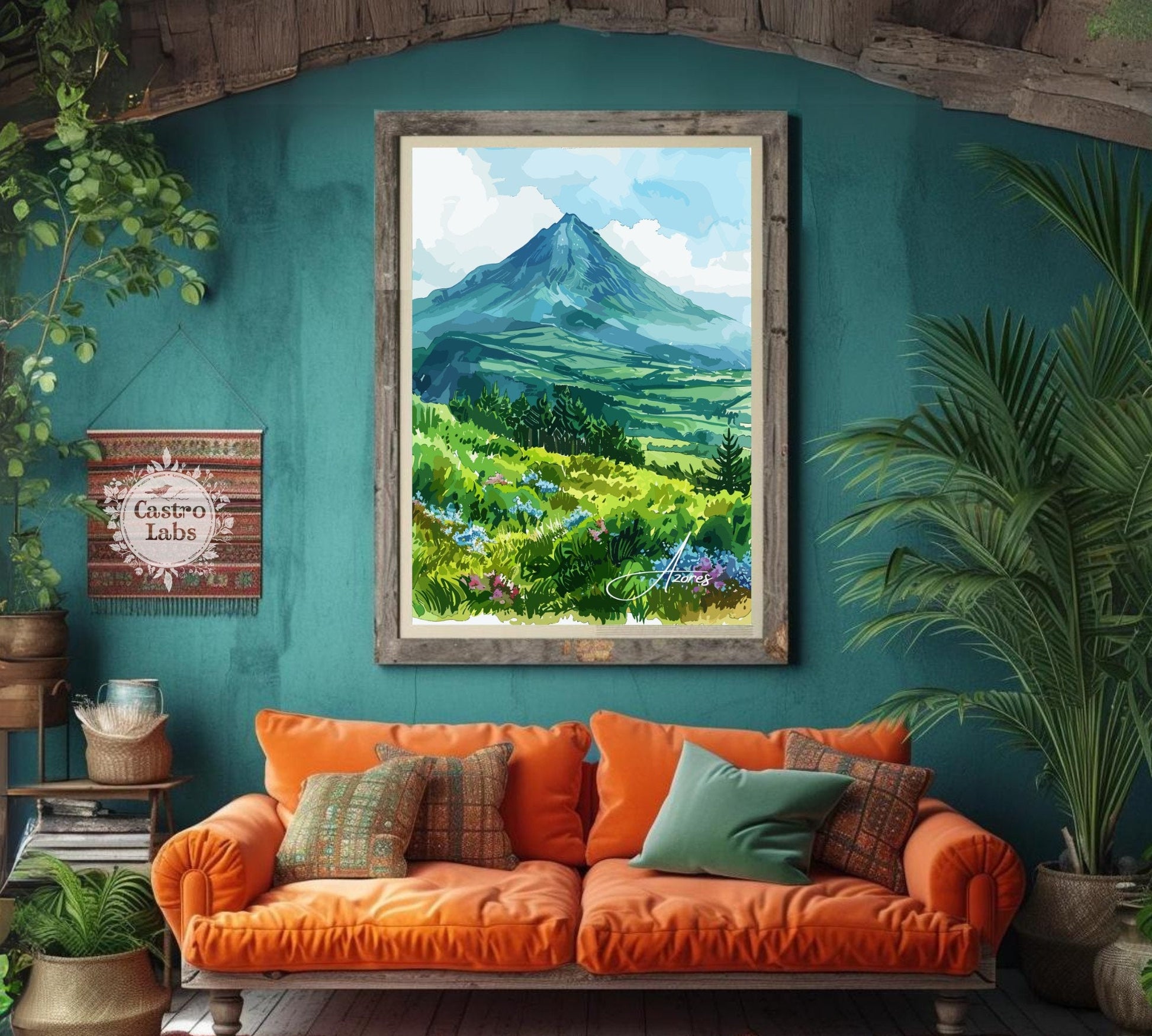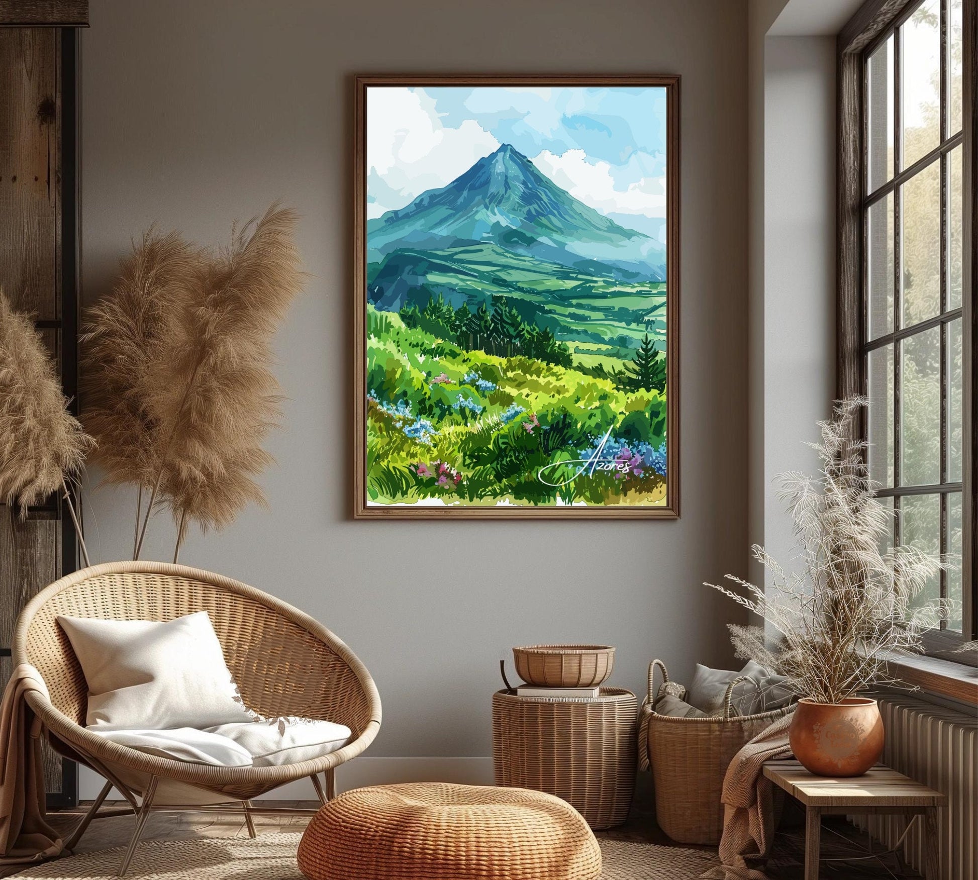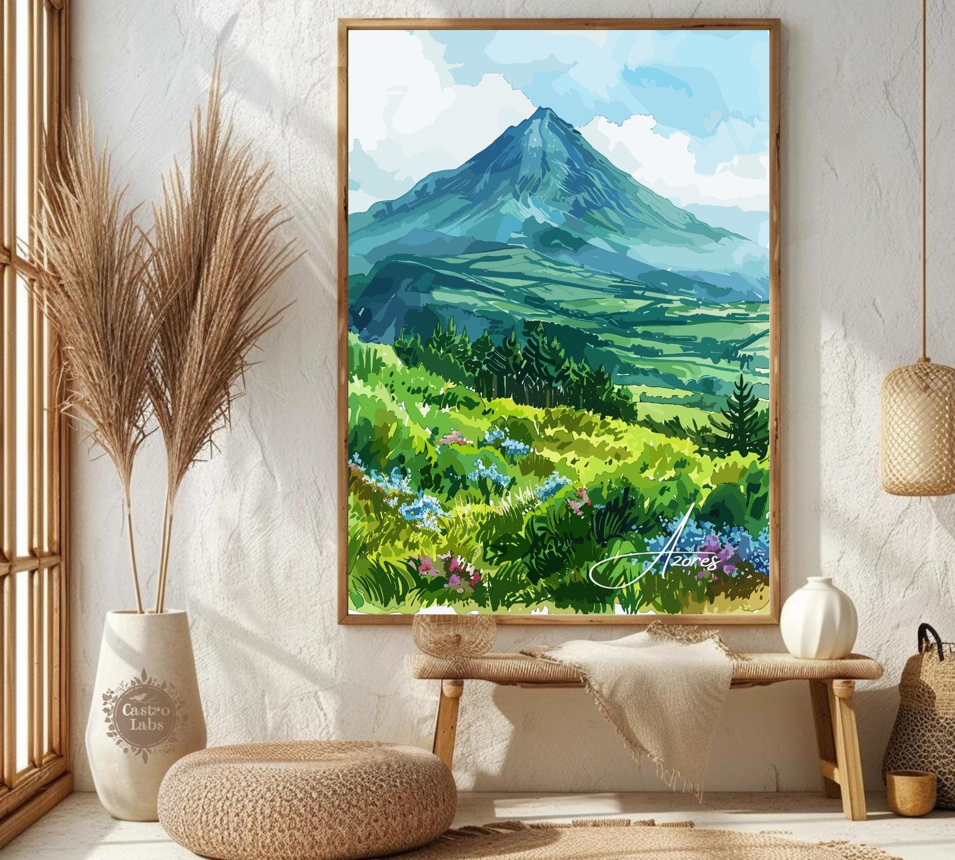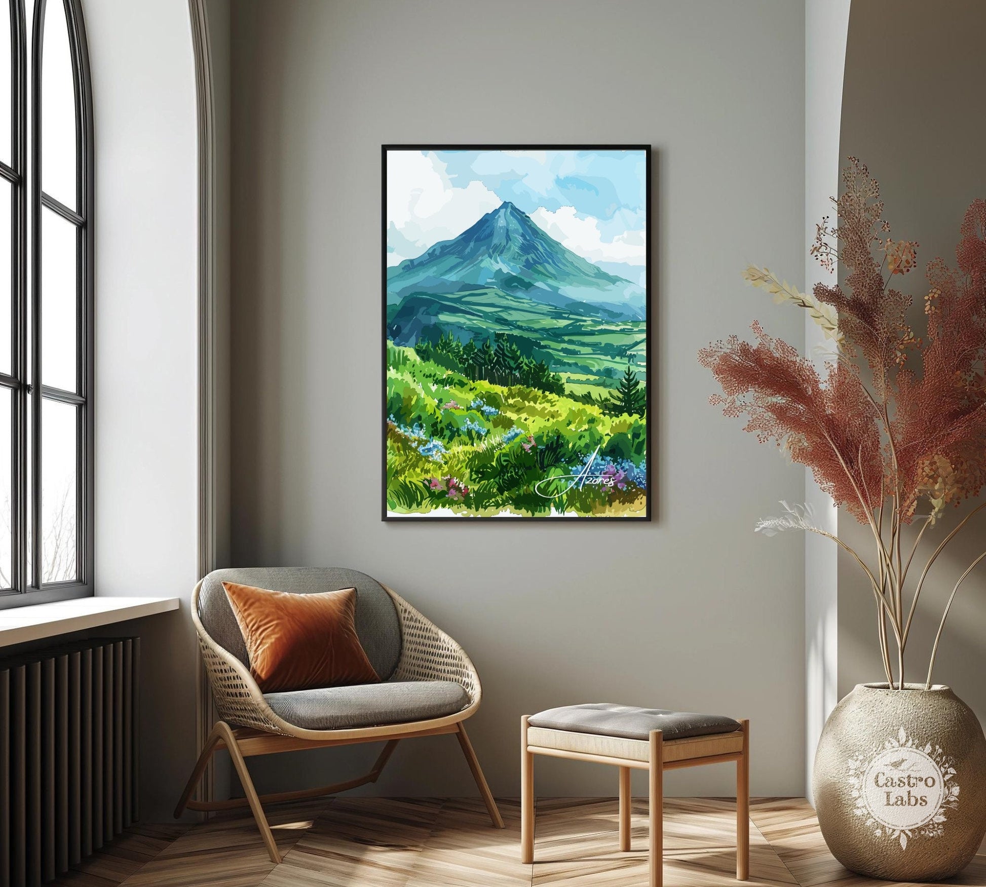 Découvrez la beauté sauvage de l'Atlantique avec cette époustouflante affiche de voyage des Açores . Mettant en scène les paysages luxuriants, les pics volcaniques et les paisibles lacs de cratère de la magnifique chaîne d'îles portugaise, cette œuvre capture l'essence même du charme naturel des Açores.