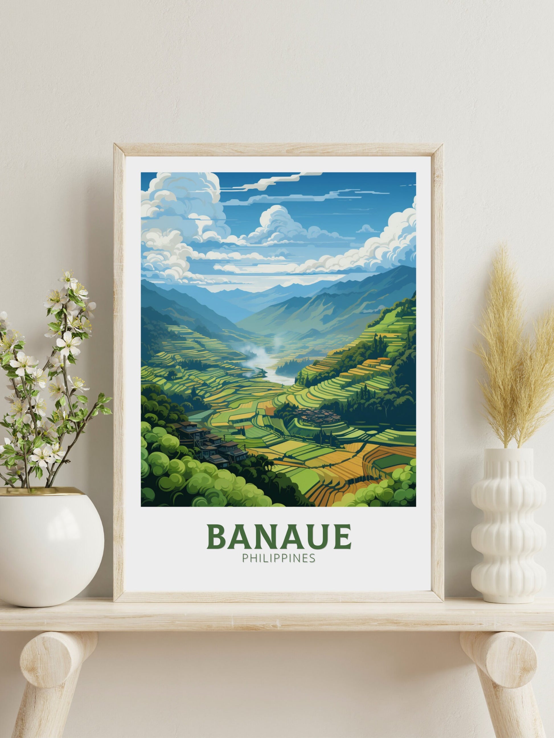 Notre affiche de voyage Banaue – Art rétro des Philippines – transporte votre intérieur vers les époustouflantes terrasses de Banaue grâce à son design vibrant. Idéale pour les passionnés de voyages et d'art, elle capture les rizières luxuriantes et les montagnes escarpées des Philippines avec un détail saisissant. Que vous ayez parcouru ses sentiers ou rêvé de ses merveilles, cette affiche rétro de Banaue sera un ajout remarquable à votre décoration.